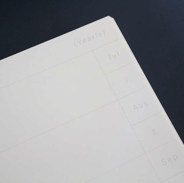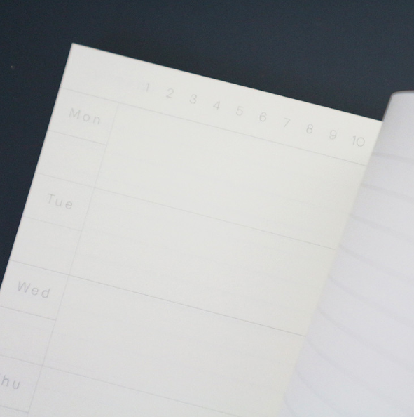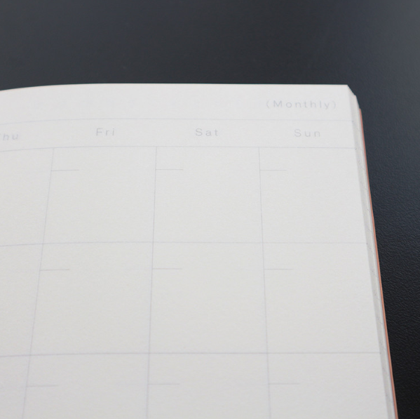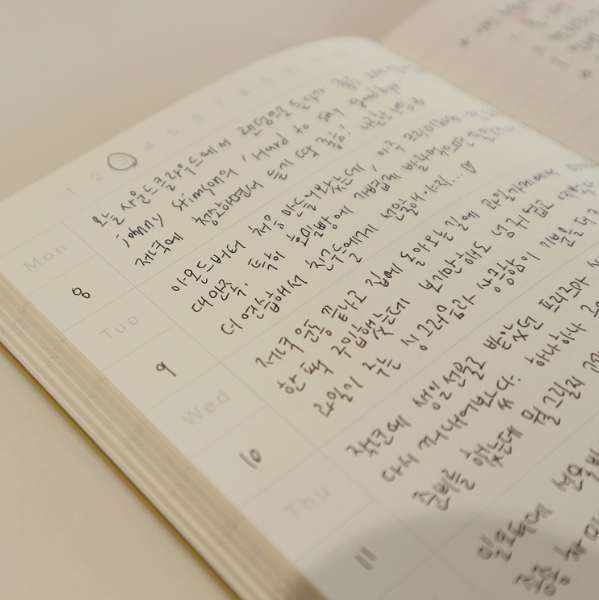소프트한 느낌이 들도록 무광 코팅으로 마무리 하였습니다. 내지는 180도로 펼쳐지는 반양장제본으로 제작되어 보다 효율적인 필기가 가능하며, 눈에 편안한 미색 모조지 100g을 사용하여 자연스러운 기록을 돕습니다.