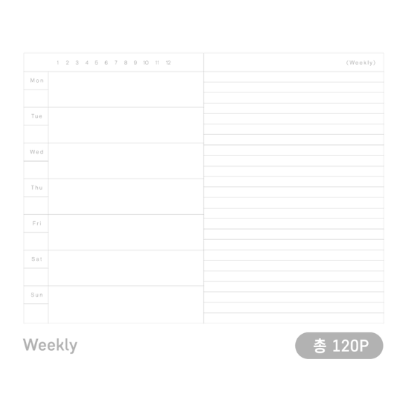 내지는 Yearly(2P), Monthly (26P), Weekly (120P), Memo (42P)로 구성되어 있으며,