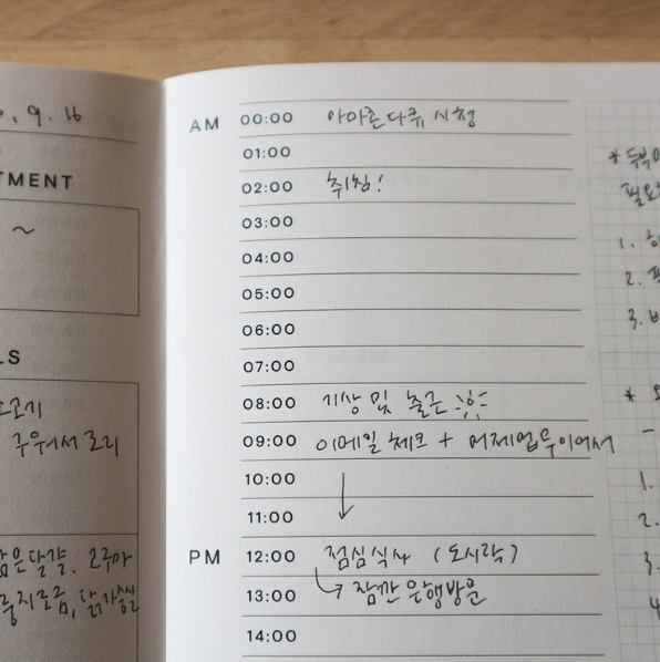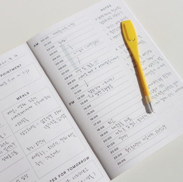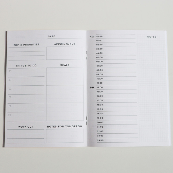 Daily는 총 23일 치의 기록이 가능한 제품으로, 좌측에 Top 3 Priorities(3가지 우선사항), Appointment(약속), Things To do (해야할 일), Meals(식사기록), Work out(운동 기록), Notes for Tomorrow(내일을 위한 메모)등 일상을 카테고리 별로 세세하게 기록할 수 있고, 우측에 시간별 일정 기록을 통해 24시간을 더욱 효율적으로 점검하고 개설해나갈 수 있도록 도와줍니다.