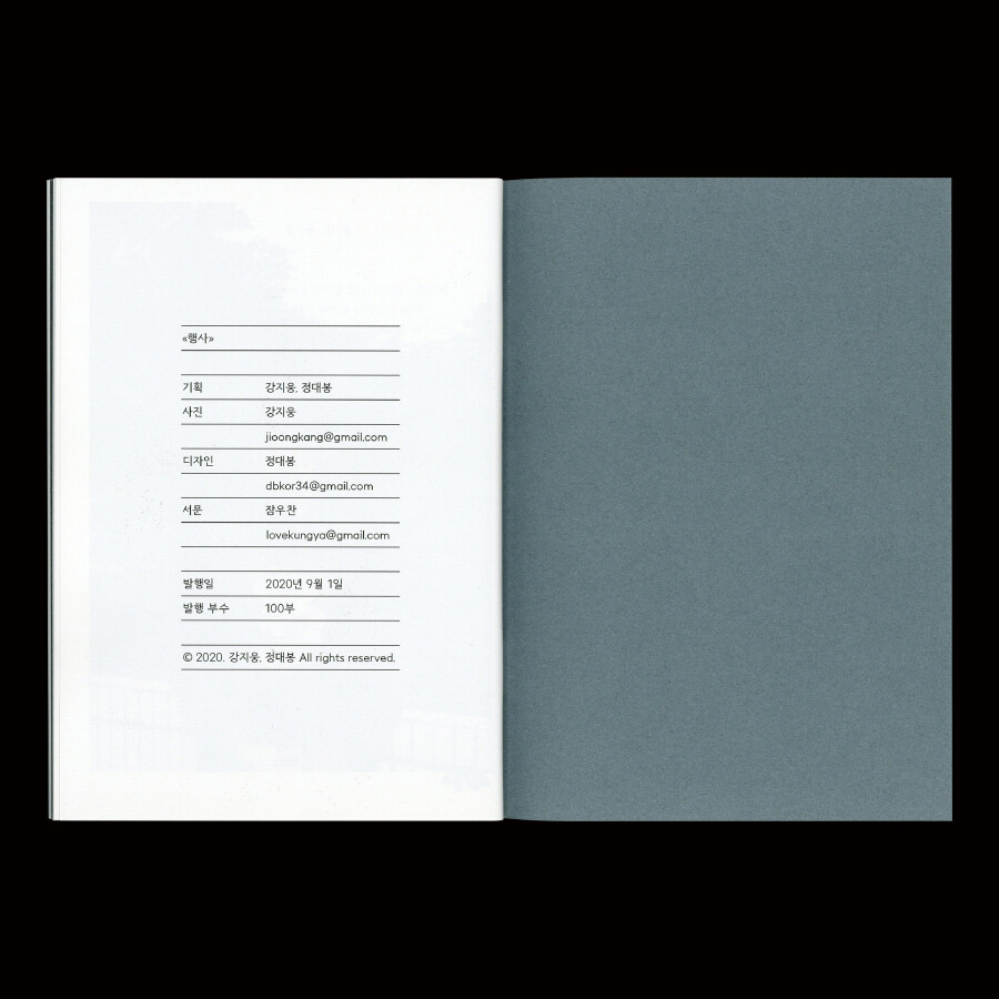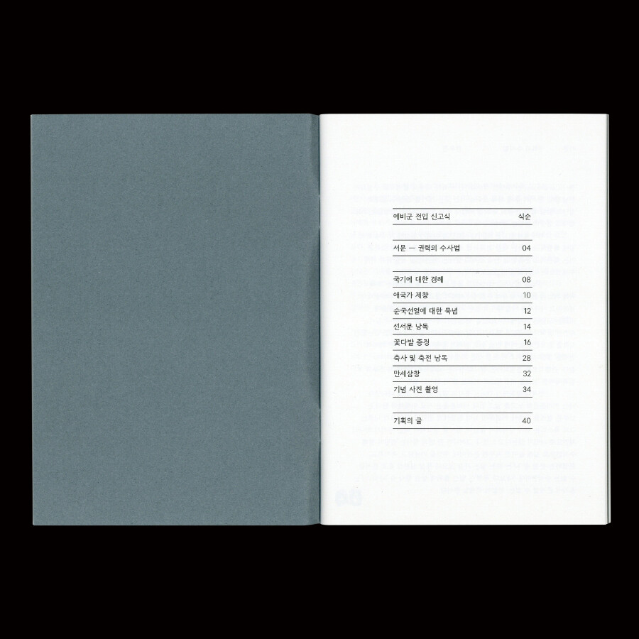 군대에서의 군인은 아주 수동적 존재에 불과하다. 목적도 모를 각종 행사에 수시로 동원되어 작위적 리액션을 요구받아온 그들은 어느새 허례허식에 누구보다 익숙해져 있었다. 이에 따라 또 하나의 형식적 행사인, 가상의 ‘예비군 전입 신고식’을 기획하고 그 진행 기록을 «행사»에 담았다. 전역과 동시에 거저 주어지는 예비군 신분을 축하하는 과장된 행사를 통해, 지금껏 빈번하게 자행되고 있는 군 내외의 각종 허례허식과 그에 대한 강요의 지점을 포착하고자 했다. 거대한 집단 아래에서 각자의 정체성이 소거된 채, 그들은 일련의 사상을 강요받는다. 그럼에도 그들은 국기에 대한 경례, 애국가 제창, 순국선열에 대한 묵념으로 이어지는 식순에 따라 그저 입술을 뻐끔거릴 뿐이다.