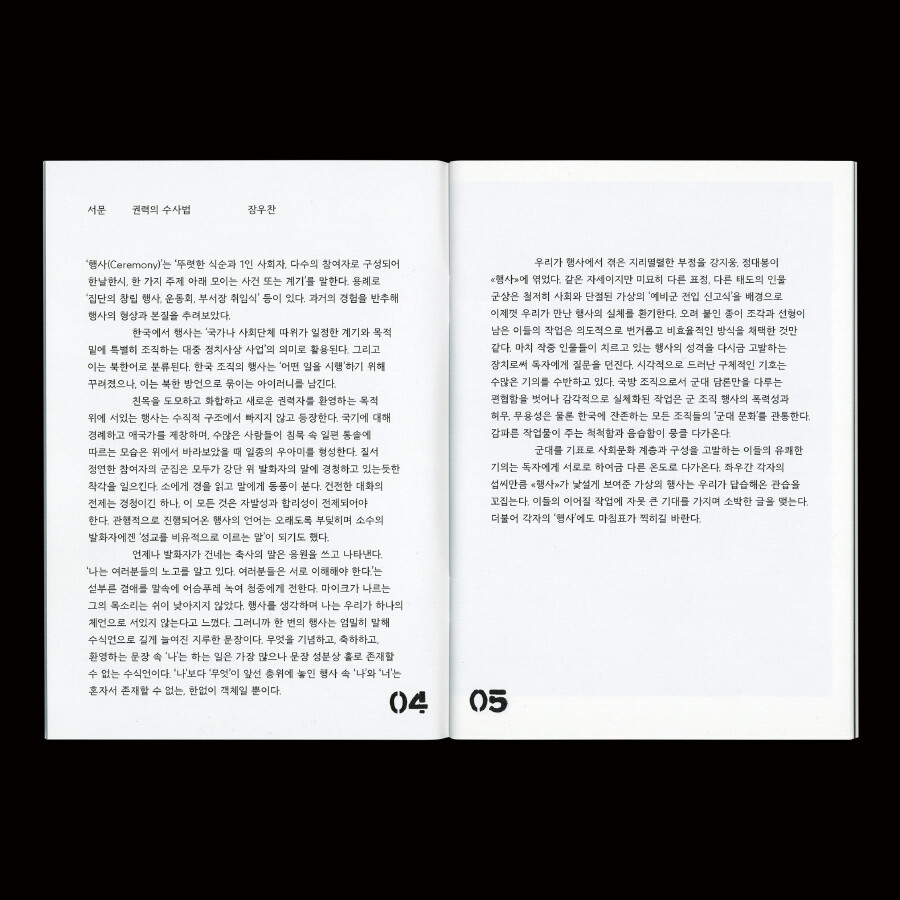 “행사를 생각하며 나는 우리가 하나의 체언으로 서있지 않는다고 느꼈다. 그러니까 한 번의 행사는 엄밀히 말해 수식언으로 길게 늘여진 지루한 문장이다. 무엇을 기념하고, 축하하고, 환영하는 문장 속 ‘나’는 하는 일은 가장 많으나 문장 성분상 홀로 존재할 수 없는 수식언이다. ‘나’보다 ‘무엇’이 앞선 층위에 놓인 행사 속 ‘나’와 ‘너’는 혼자서 존재할 수 없는, 한없이 객체일 뿐이다.” (서문에서 발췌)