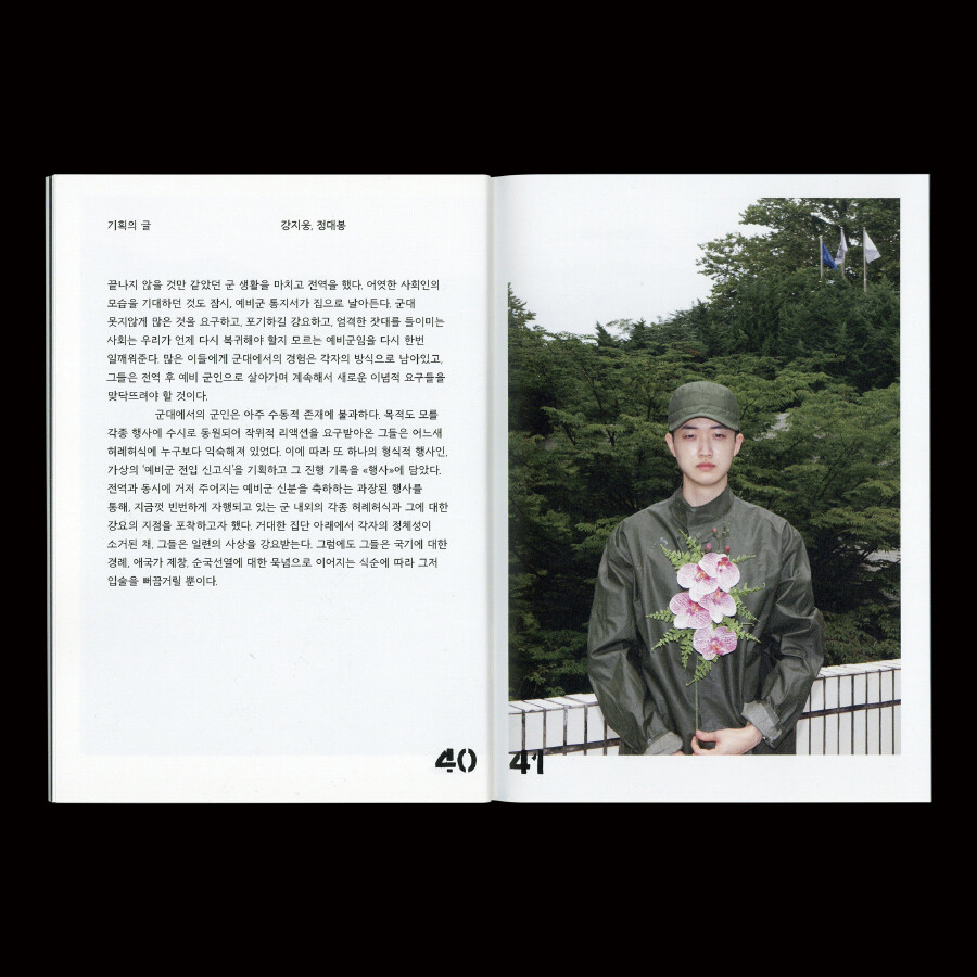 강지웅과 정대봉은 홍익대학교에서 시각 디자인을 공부하고 있다. 최근에는 집단성과 보수성을 바탕으로 존재하는 군대라는 기이한 집단 속에서의 경험을 곰곰 반추하며 사진과 그래픽 디자인을 기반으로 작업 중이다.