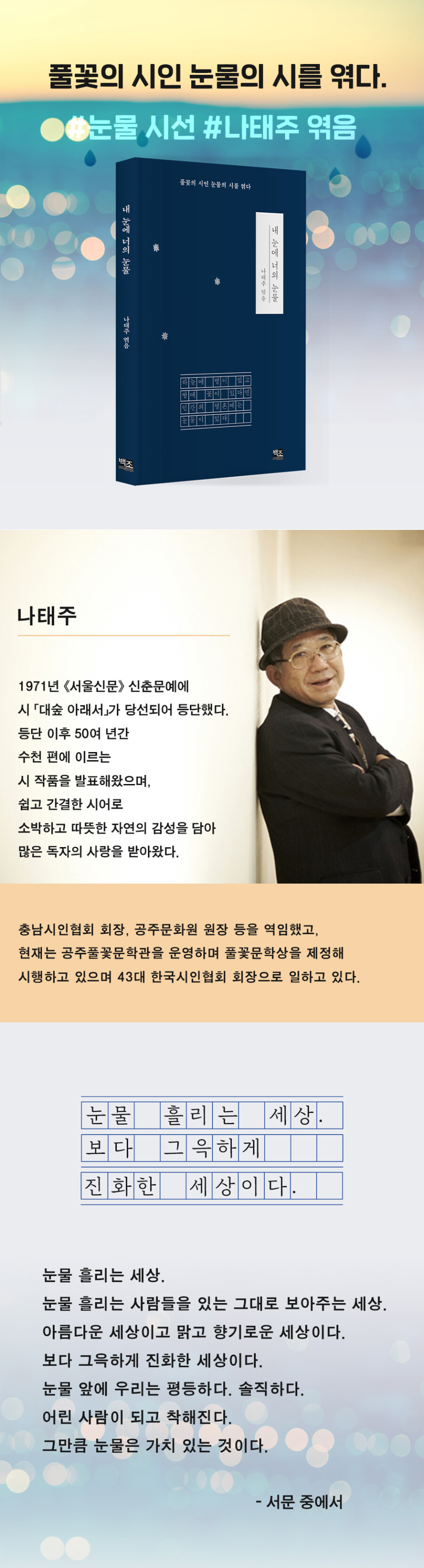 나태주 시인이 뽑은 ‘눈물’ 시선집 『내 눈에 너의 눈물』이 출간되었다. 『내 눈에 너의 눈물』은 ‘눈물과 슬픔’을 주제로 쓰여진 60여 명의 시인들의 시가 묶인 테마 시선집이다.
