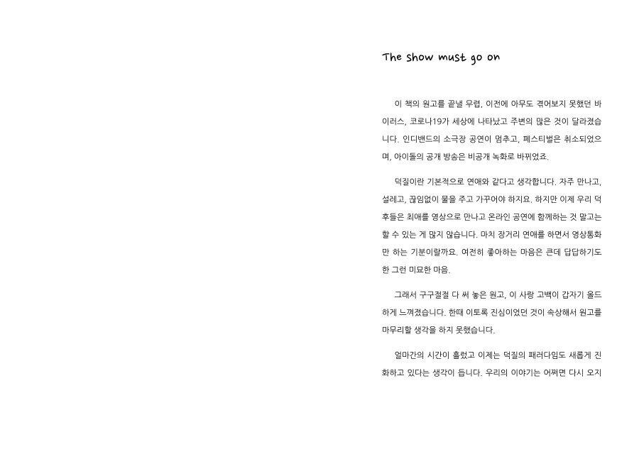 덕질에 관한 설레는 기억과 무거운 생각들을 모두 담았다.