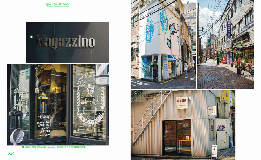 사람이 가장 직접적이고 많은 광고에 노출이 될 때가 바로 길을 걸을 때입니다. 길 5분만 걸어도 그 지역의 분위기를 알 수 있고, 각 상점의 '얼굴'이라 할 수 있는 파사드 수십 개를 볼 수 있죠. 그 안에는 로고부터 디스플레이 방식, 간판, 조경, 인테리어가 다 들어있습니다. 외관은 돈과 인력, 시간 모든 면에서 투자가 많이 되는 곳이기도 하죠. 실제 디자인할 때 가장 도움이 많이 되는 방법은 폰 하나만 들고나가 거리를 걸으며 디자인 방식에 대해 관찰하던 것이었습니다. 그리고 이와 비슷한 디자인 서적은 종종 볼 수 있지만, 저는 그동안 없었던 서울을 모아봤습니다.