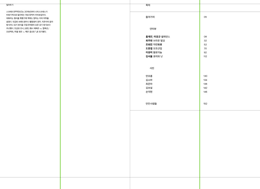 SPREAD스프레드는 디자인 스튜디오 나이스프레스가 만난 여성 창작자들의 인터뷰 모음집이다.