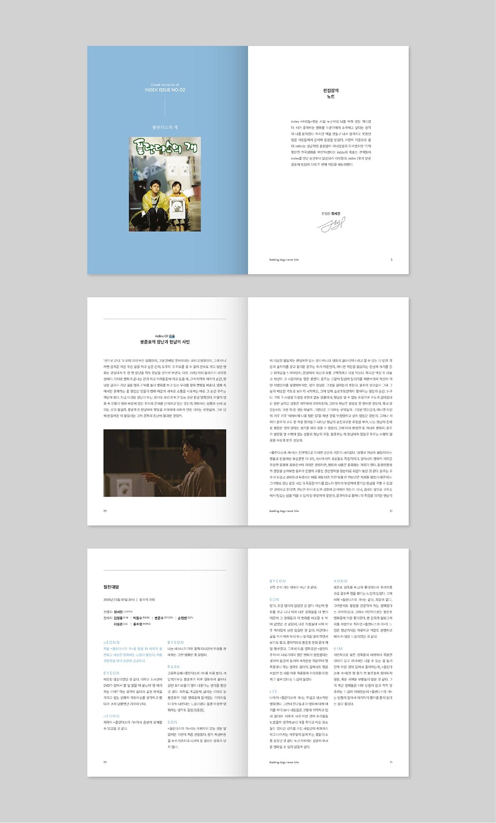 index <플란다스의 개>편은 index <우리들>편과 마찬가지로 8명의 다양한 관객층의 감상평이 담겼을 뿐 아니라 봉준호 감독님의 인터뷰 6페이지, 윤가은 감독님의 추천사 등 <플란다스의 개>에 관한 다채로운 내용들로 가득 차 있습니다.