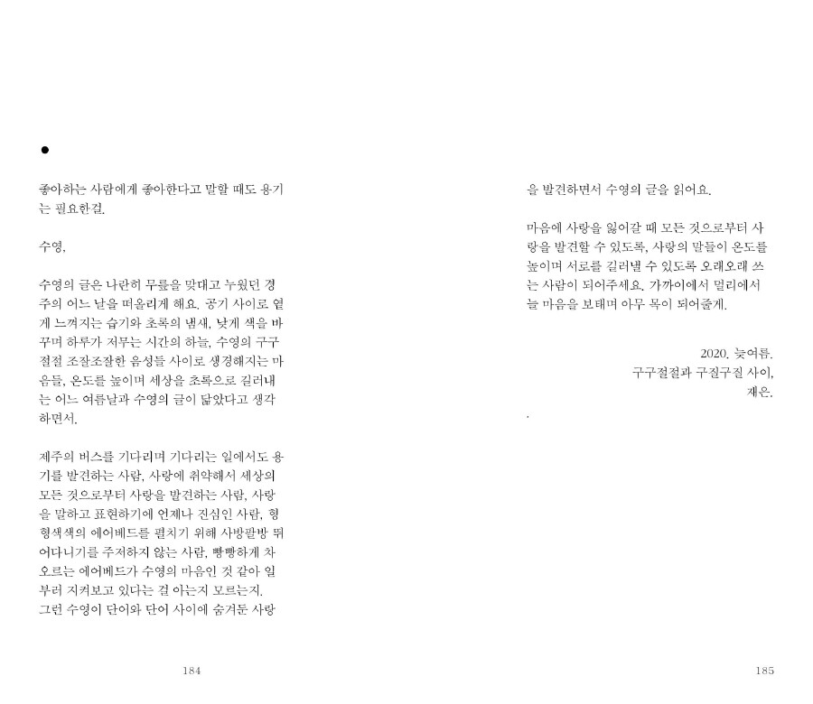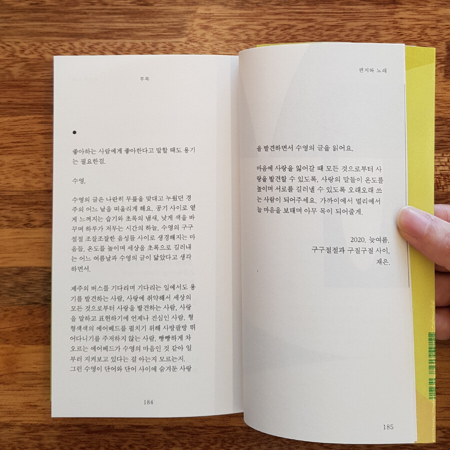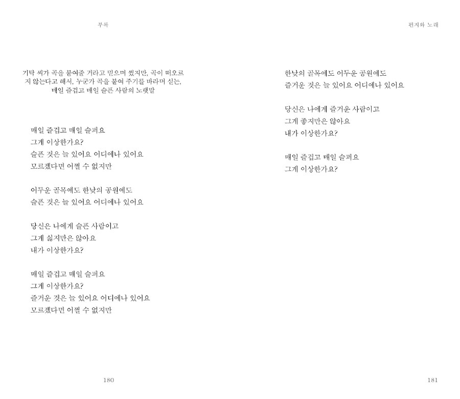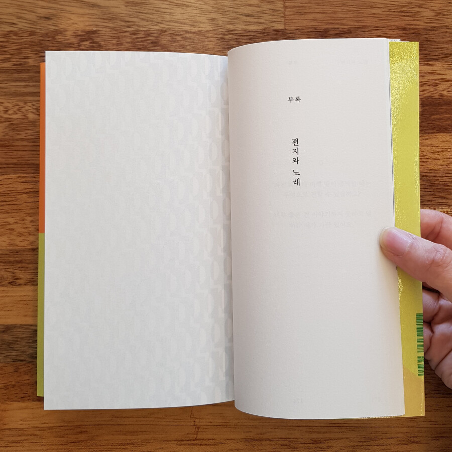 1~3부 본문 중간중간 편지글이 삽입되어 있으며, 마지막 <부록> ‘편지와 노래’에서는 함께 부르고 싶은 노래와, 이쪽에서 그쪽으로 부치는 편지, 그리고 언젠가 받았던 편지 두 통을 실었다.