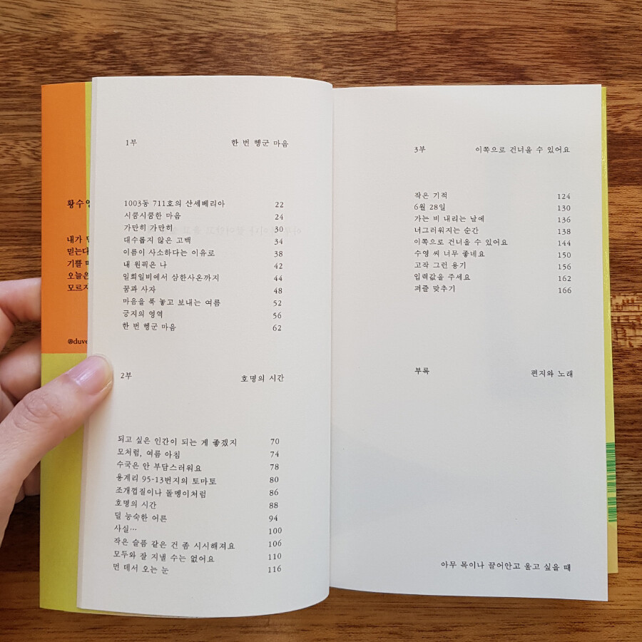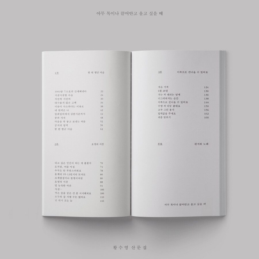 <1부> ‘한 번 헹군 마음’에서는 혼자 웅크리고 있는 자세의 이야기를, <2부> ‘호명의 시간’에서는 이쪽에서 그쪽으로 손을 뻗는 자세의 이야기를 실었다. <3부> ‘이쪽으로 건너올 수 있어요’에서는 건너올 다리가 없어도 그쪽에서 이쪽으로 건너오는 이들의 자세를 떠올리며 이야기를 모았다.