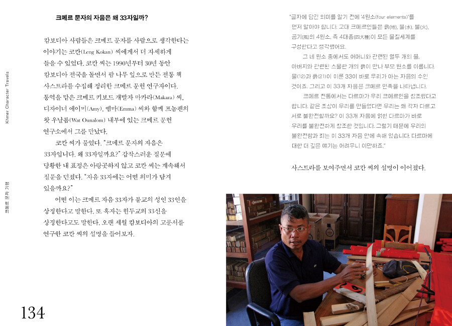 저자 노성일은 낯선 크메르 문자의 매력에 빠져 직접 캄보디아를 누비며 전문가들을 만났다. 이 책에는 크메르 문헌 연구자, 캄보디아 그래픽 디자이너, 크메르 폰트 디자이너, 크메르 디자이너 커뮤니티, 캄보디아 출판사 편집장, 캄보디아 잡지 편집장, 고대 크메르 문헌 수집가, 크메르 유니코드 키보드 개발자, 크메르 모바일 키보드 개발자, 캄보디아 서점, 캄보디아 인쇄소, 캄보디아 국립도서관 사서, 크메르 폰트 의 선구자, 앙코르 유적 복원 전문가, 대사관 캄-한 전문통번역사, 킬링필드 연구자, 크메르 캘리그래퍼, 고대 산스크리트어 연구자, 태국 폰트회사 등 캄보디아와 동남아시아 문자 전문가 40여 명을 직접 만나 듣고 배운 생생한 이야기가 담겨 있다.