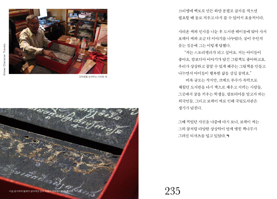 크메르 루주는 지식을 어쩜 그렇게도 증오했을까? 민족의 지식과 기억을 간직한 사람들의 생명을 빼앗는 것을 넘어 그 기억을 기록한 책, 심지어 기록 도구까지 모조리 없애버릴 정도로 말이다. 사람을 닮은 크메르 납 활자가 하루아침에 총알이 되어 생명을 빼앗는 도구가 되었다. 스러진 생명이 살아날 수 없는 것처럼 사라진 기록도 돌아올 수 없다. 크메르 루주 이전 캄보디아인의 기록들은 대부분 사라졌지만, 내전의 잿더미에서 자료를 모으고 역사를 기억하기 위해 살아가는 사람들이 있다는 사실이 마음을 울린다. (245p)