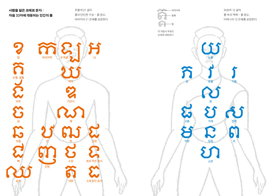 문학에서 등장인물을 나타내는 영단어 캐릭터(character)에는 ‘문자'라는 뜻도 있다. 크메르 문자는 세계 모든 문자 중 가장 ‘캐릭터'답다. 크메르 문자는 사람을 닮았다. 글자 각 부분의 이름도 몸과 관련 되어 있고, 자음 33자는 각각 몸의 부위를 상징한다. 이 책은 사람을 닮은 크메르 문자의 이야기를 한 사람의 인생에 빗대어 탄생-성장-성년-중년-노년-순환으로 이어지는 과정으로 소개한다.