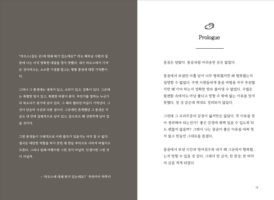 한 달 간 안식휴가로 다녀온 호주 여행 에세이 <31: 한 달 간의 호주 여행 나의 안식휴가 이야기>와 몽골에서의 색다른 여행 경험을 기록한 <와이파이가 안돼서 답장을 못했어요>를 출판했습니다.