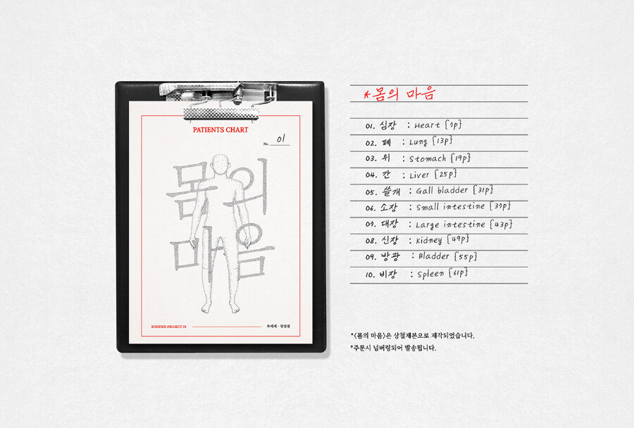 <몸의 마음>은 사람의 몸 속 장기 10개의 특징을 잡아 하나의 시로 적어 내려간 차트형 시집입니다.