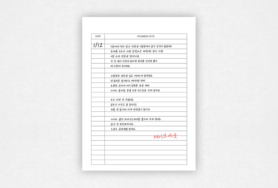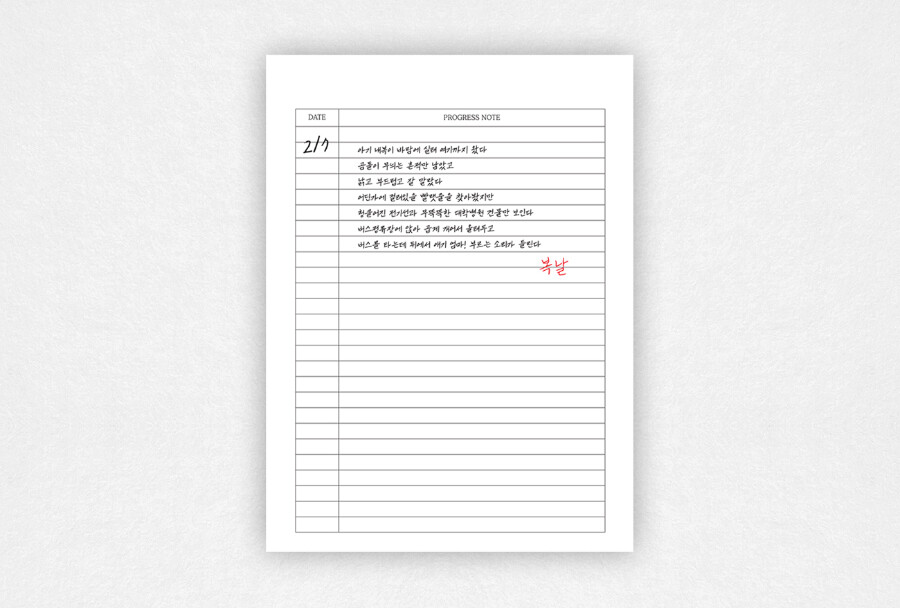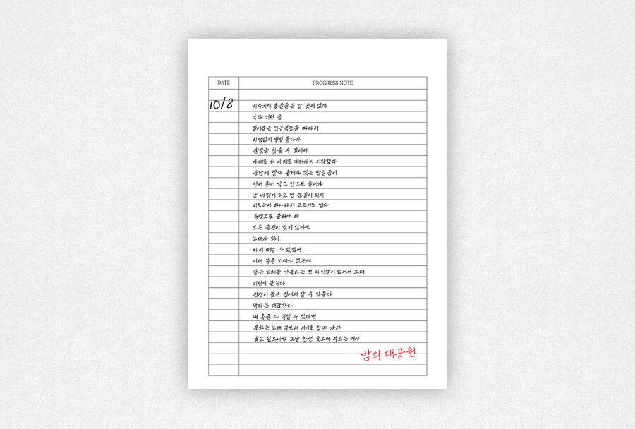 진료기록부에 적힌 건조하고 딱딱한 글들이 현실이라면 다음 장으로 이어지는 시는 현실을 감당하고 있는 마음을 표현하고 있습니다.