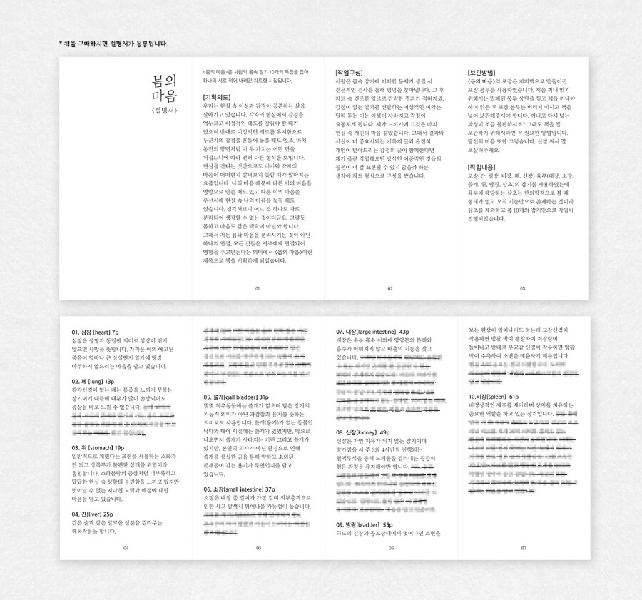 현실을 견디는 것만으로도 버거워 각자의 마음이 어떠한지 살펴보지 못할 때가 많아지는 요즘입니다. 나의 마음 때문에 다른 이의 마음을 엉망으로 만들 때도 있고 다른 이의 마음을 우선시해 현실 속 나의 마음을 놓칠 때도 있습니다. 생각해보니 어느 것 하나도 분리되어 생각할 수 없는 것이더군요. 그렇듯 몸하고 마음도 같은 맥락이 아닐까 합니다. 그래서 저는 몸과 마음을 분리시키는 것이 아닌 하나의 연결, 모든 것들은 서로에게 연결되어 영향을 주고받는다는 의미에서 <몸의 마음>이란 제목으로 책을 기획하게 되었습니다.