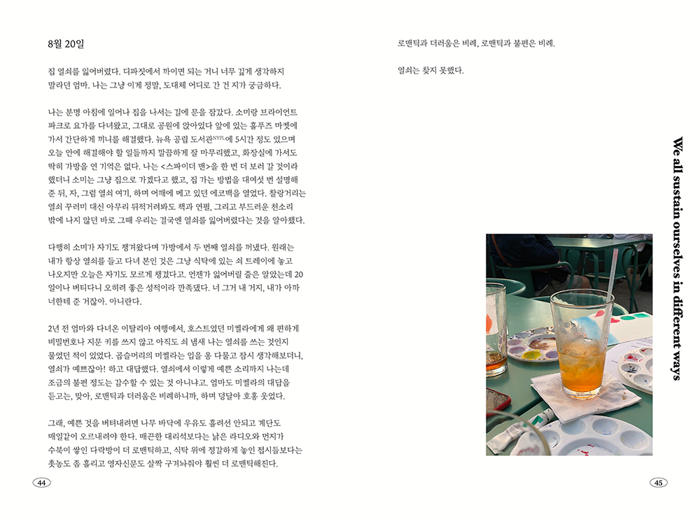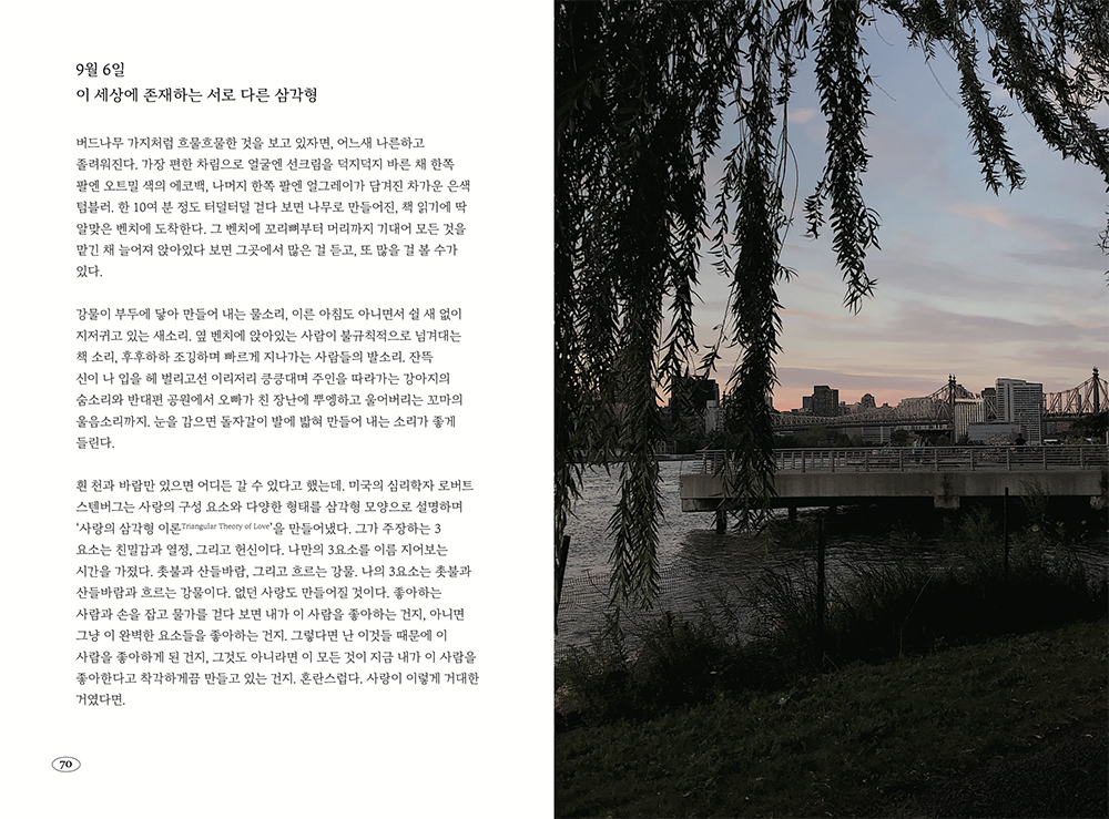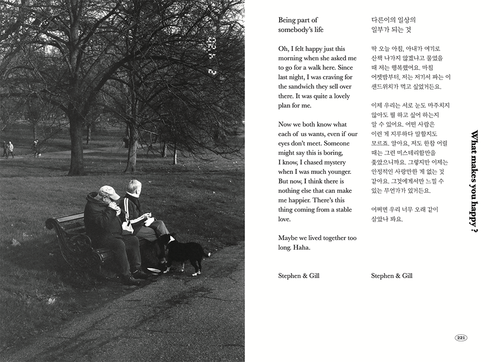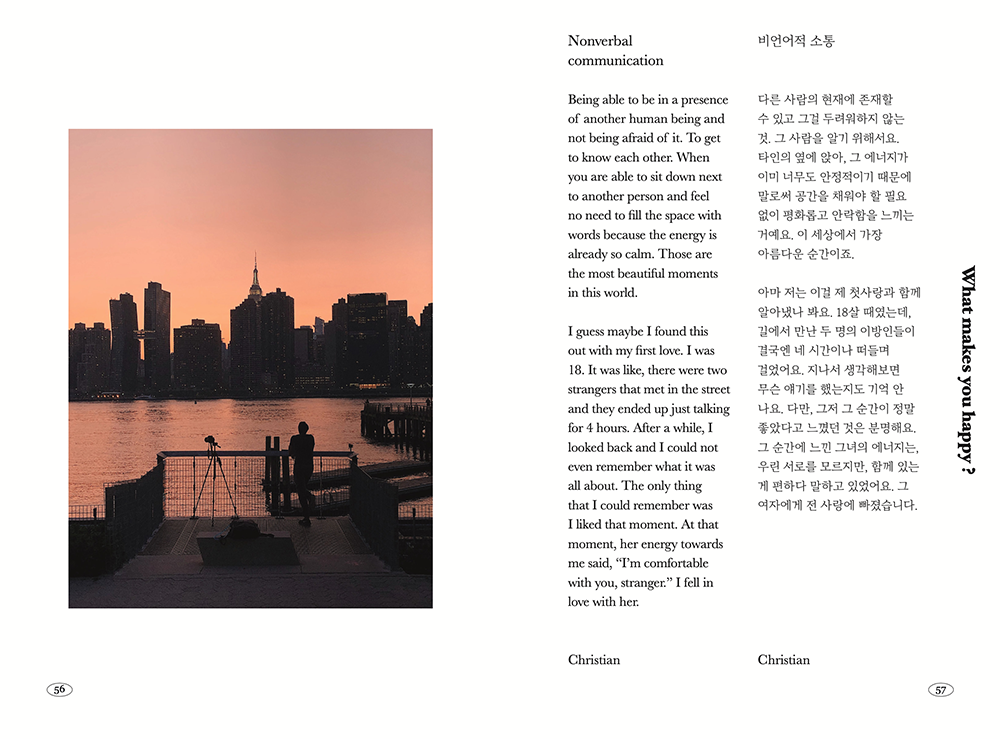 한 도시에서 어느 사회에도 소속되지 않고 오랜 시간을 이방인으로 여행하며 사는 도중에는 정말 당연하게도 우울의 순간들이 찾아왔습니다. 그럴 때마다 저는 이 프로젝트를 곱씹으며 힘을 얻었어요. 부정적인 생각이 들 때마다 뉴욕, 파리, 런던 할 것 없이 카페나 공원을 찾아 인터뷰 녹음 파일을 정리하고 일기를 썼습니다. 그러다보니 신기하게도 어느새, 제 질문에 답을 해준 사람들의 좋은 기운이 전해지는 것을 느낄 수 있었습니다. 저는 긍정적인 이야기가 가진 힘을 믿는답니다. 그걸 한 데 묶고 싶었어요 !