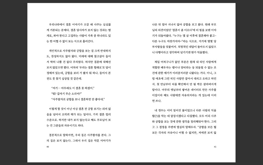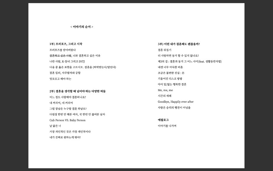 하지만 생각이 많은 저는 마음 한켠이 갑갑합니다. 결혼은 선택 이라던데 어째 온전한 내 선택 같지가 않고...