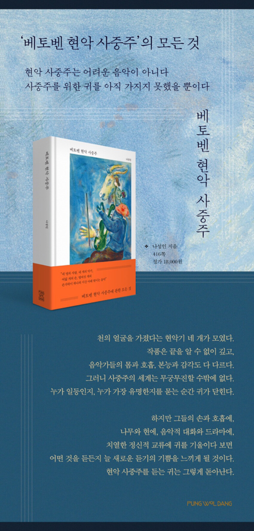 베토벤은 교향곡, 협주곡, 피아노 소나타, 현악 사중주, 가곡, 오페라 등 클래식 음악의 거의 모든 분야에 위대한 작품을 남겼다. 그러나 많은 사랑을 받는 다른 장르에 비해 현악 사중주의 매력에 접근하는 애호가는 의외로 많지 않다. 그것은 베토벤 후기 사중주곡의 난해한 인상에 기인한 바가 크지만, 근본적으로는 그동안 우리의 듣기가 주로 크고 화려하며 선율적인 음악에 맞춰져 있었기 때문일 것이다. 인문학과 클래식의 만남에 주목하여 강의와 저술 활동을 해온 저자 나성인은 작고 내밀한 음악인 현악 사중주를 통한 ‘새로운 듣기의 기쁨’을 이야기한다. 저자는 베토벤 현악 사중주를 듣고, 매료되고, 연구하며 얻은 경험을 바탕으로 현악 사중주를 새롭게 조명한다.