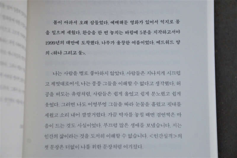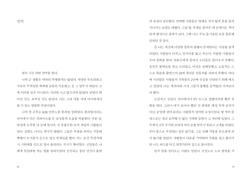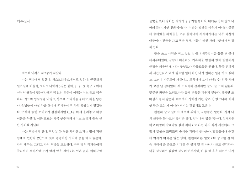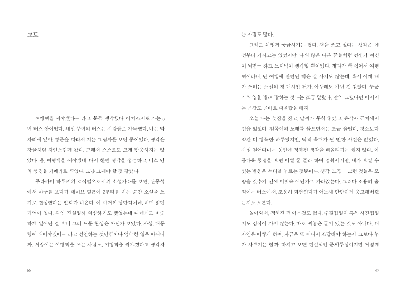 "이 책에는 16년 4월부터 18년 10월까지 써낸 64개의 글이 실려 있습니다. 그동안 저는 의무경찰이었다가, 여행자였다가, 책방 점원이었다가, 연극의 연출이기도 했습니다. 즉, 무엇이라고 분명히 말할 수 없는 사람이었던 셈입니다. 글 역시 마찬가지입니다. 수필도, 단편소설의 일부도, 연극 대본의 장면도 있습니다. 서로 다른 글들을 설명할 수 있는 하나의 주제가 존재할 수도 있겠지만, 저는 요약하는 일에는 영 서툰 사람입니다. 죄송합니다. 여러모로 흐릿한 성격의 책이지만, 모아두고 보았을 때는 쓴 사람의 모습이 그려지면 좋겠다고 생각합니다."