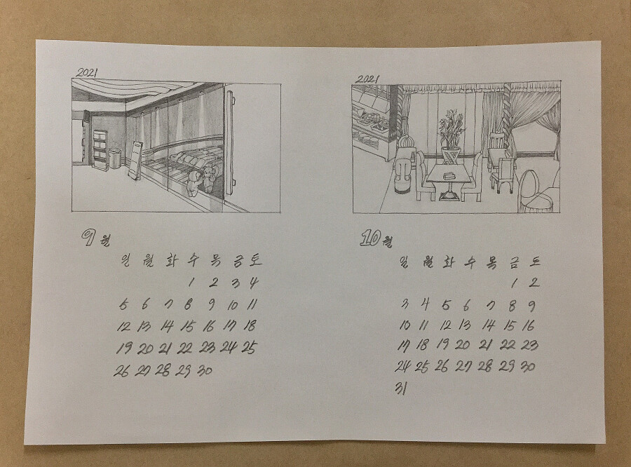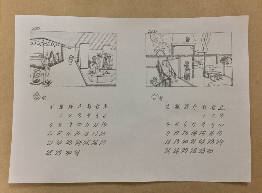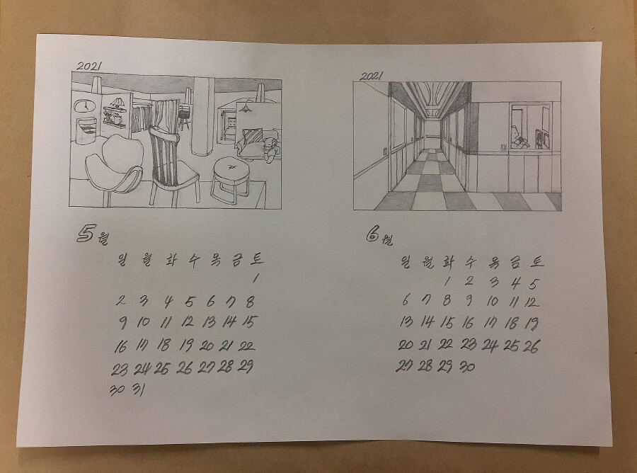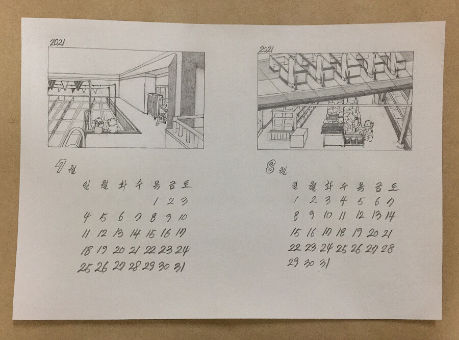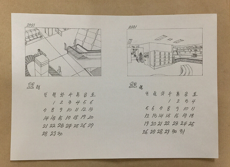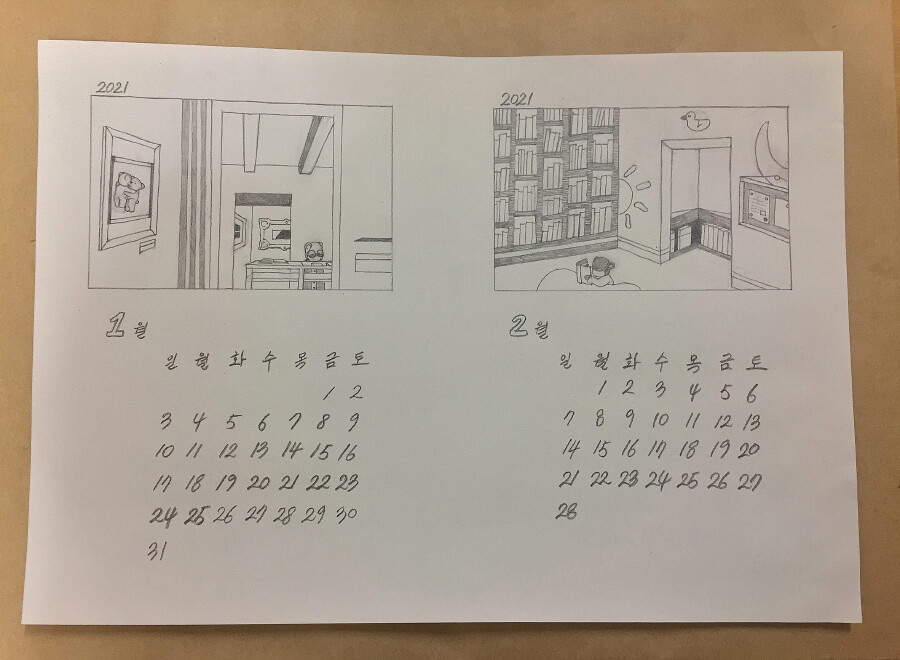 서로 얼굴을 마주하고 만나는 날이 얼른 오기를 바라며 일상 속 실내 공간에서의 모습을 12장의 그림으로 담았습니다.