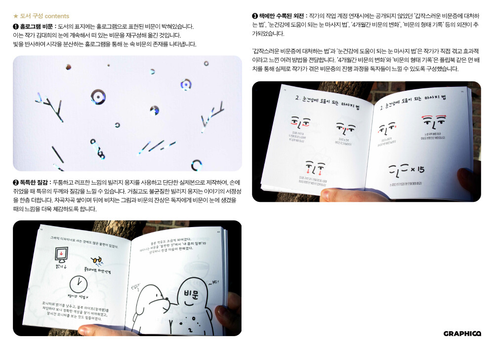 ‘갑작스러운 비문증에 대처하는 법’과 ‘눈건강에 도움이 되는 눈 마사지 법’은 작가가 직접 겪고 효과적 이라고 느낀 여러 방법을 전달합니다. ‘4개월간 비문의 변화’와 ‘비문의 형태 기록’은 플립북 같은 면 배치를 통해 실제로 작가가 겪은 비문증의 진행 과정을 독자들이 느낄 수 있도록 구성했습니다.