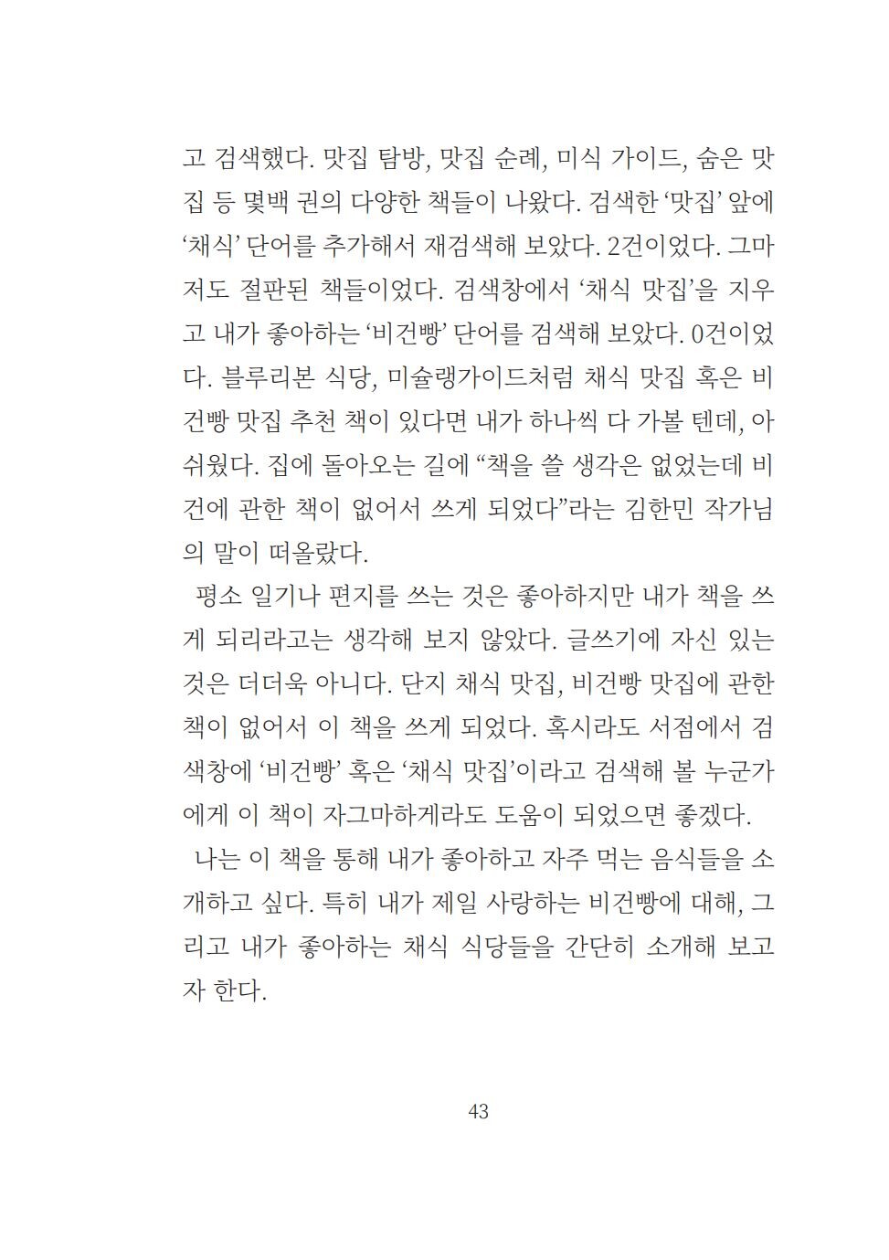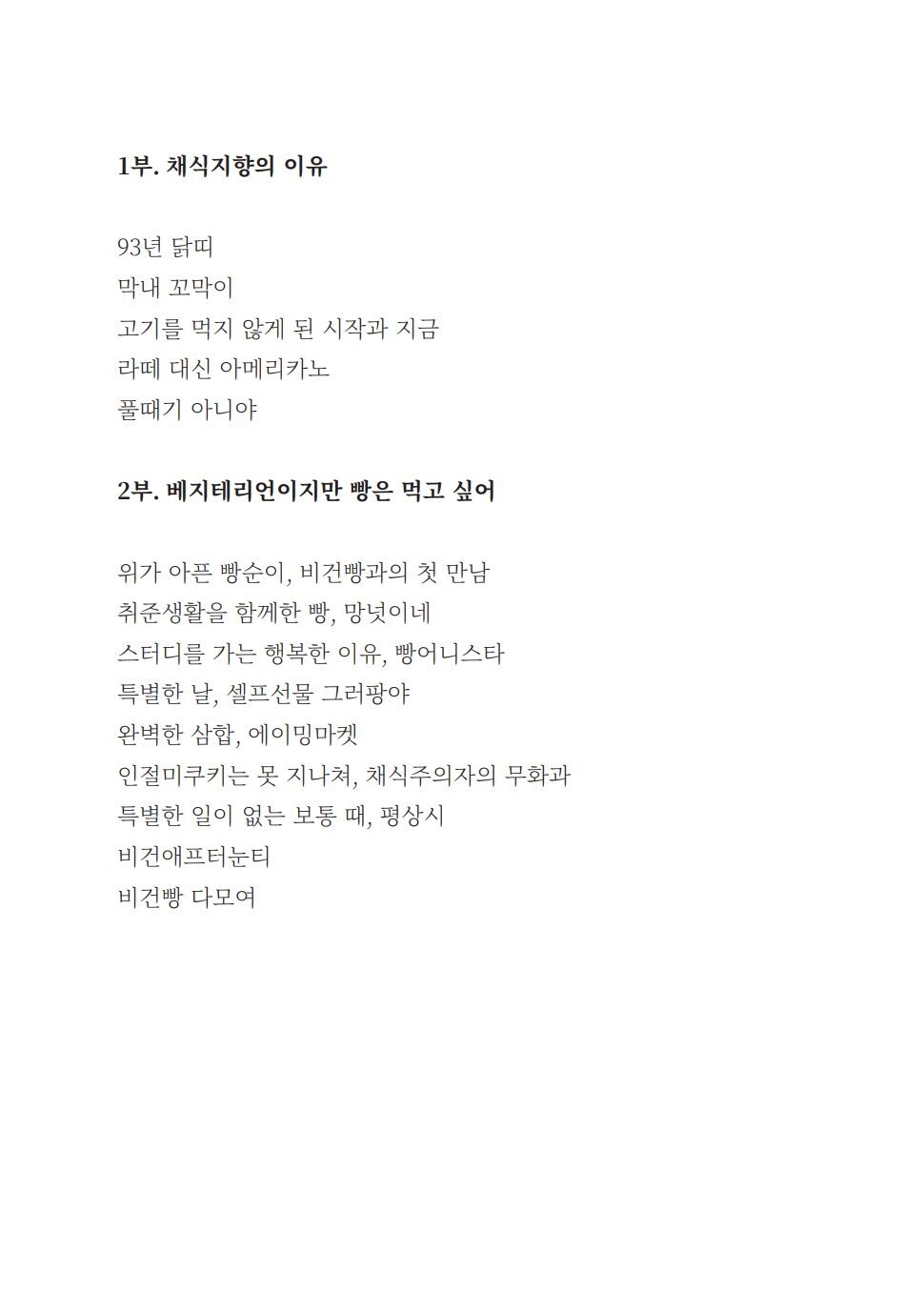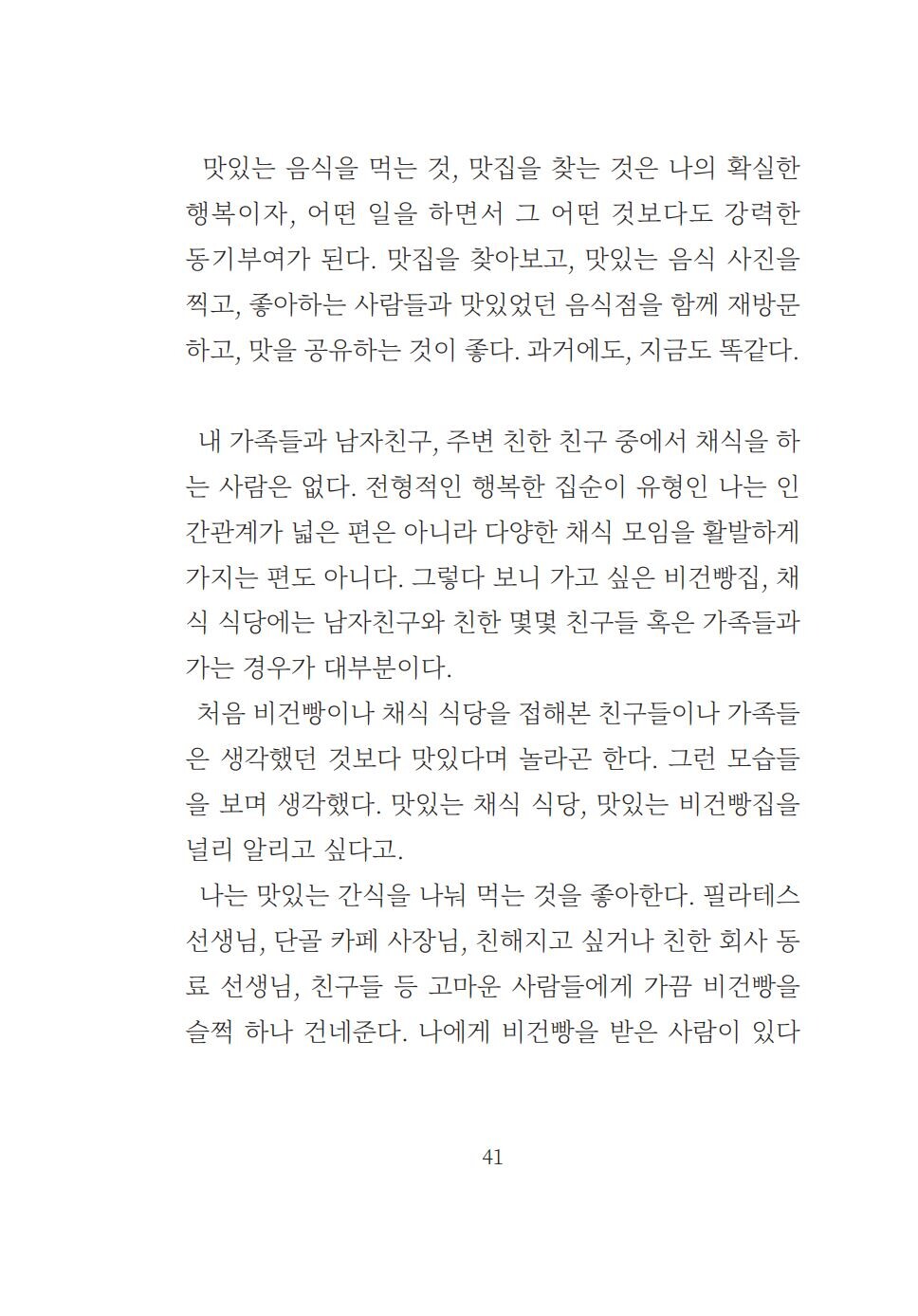 비건빵 이외에도 비건 식당 맛집, 비건 간식 추천들이 담겨있다. 맛있는 것 들은 널리 알려 함께 먹고 싶은 빵순이의 마음을 가득 담은 포토 에세이이다.