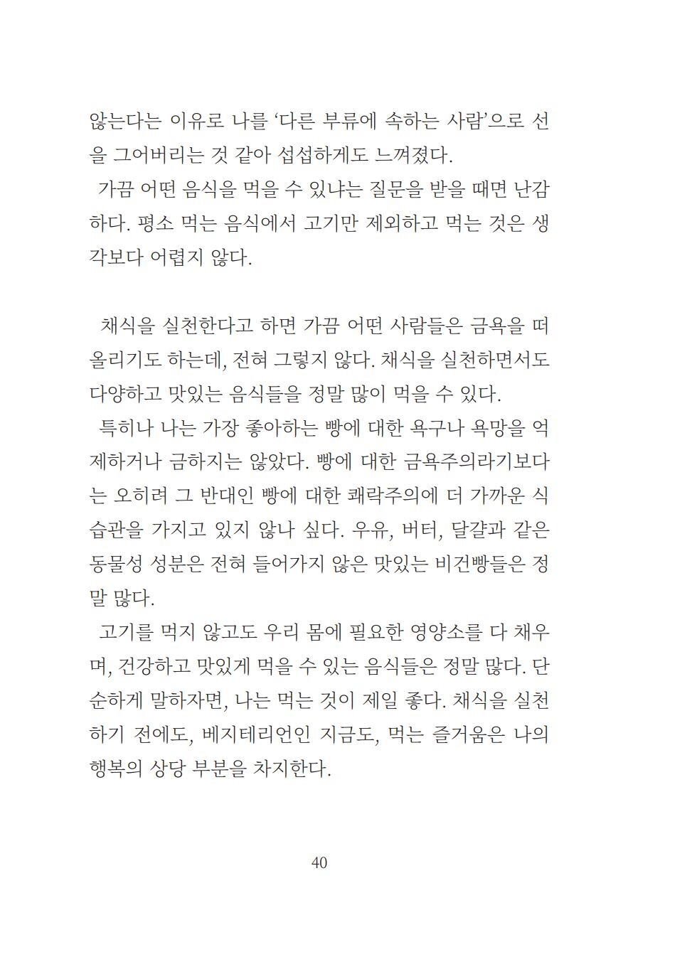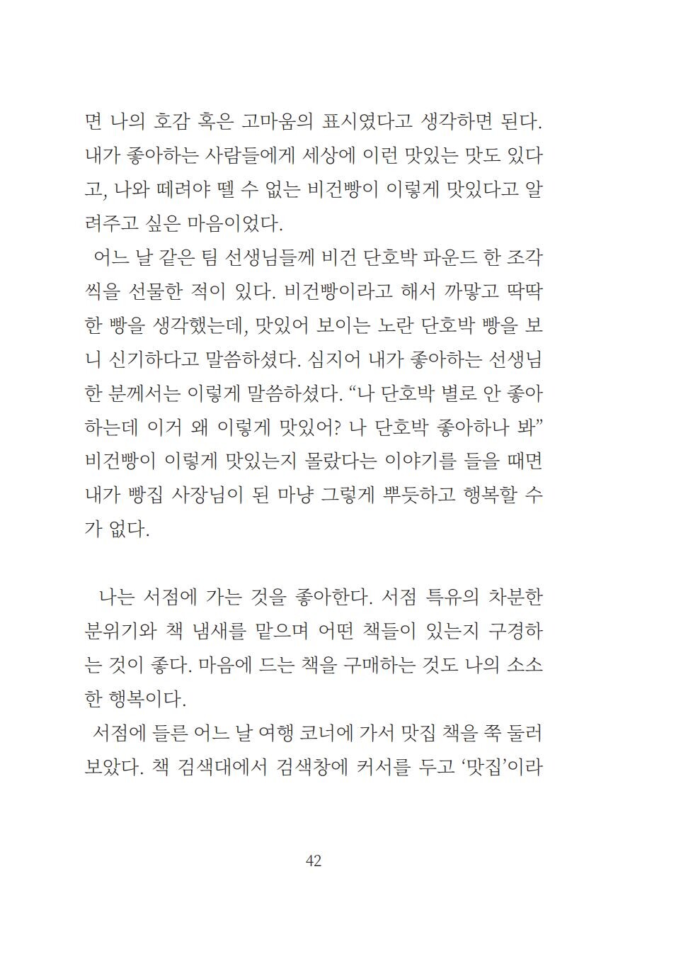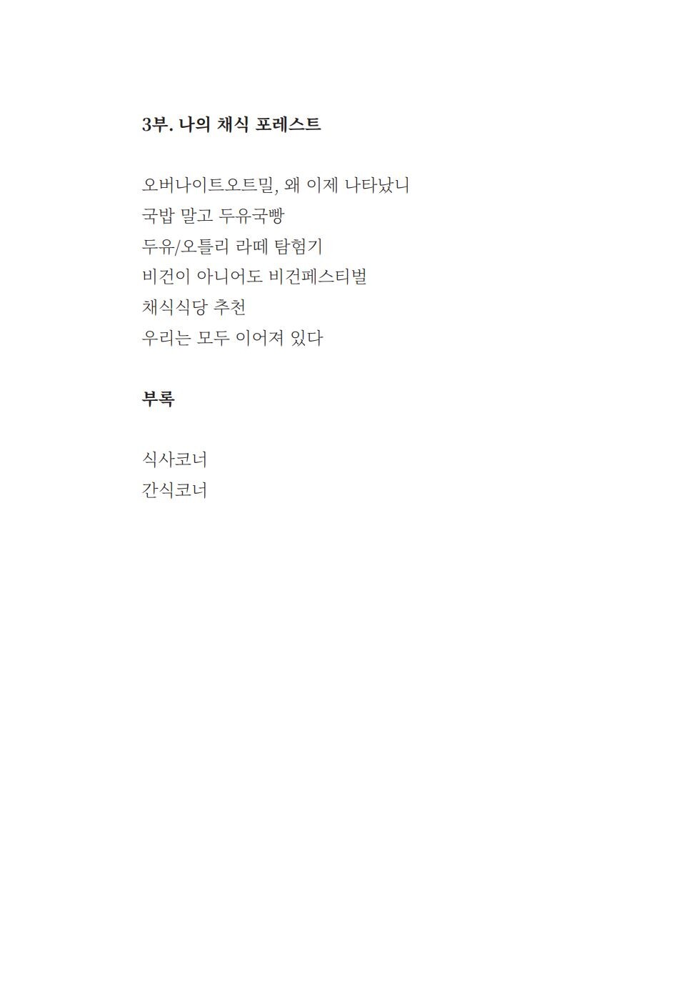 비건빵 이외에도 비건 식당 맛집, 비건 간식 추천들이 담겨있다. 맛있는 것 들은 널리 알려 함께 먹고 싶은 빵순이의 마음을 가득 담은 포토 에세이이다.