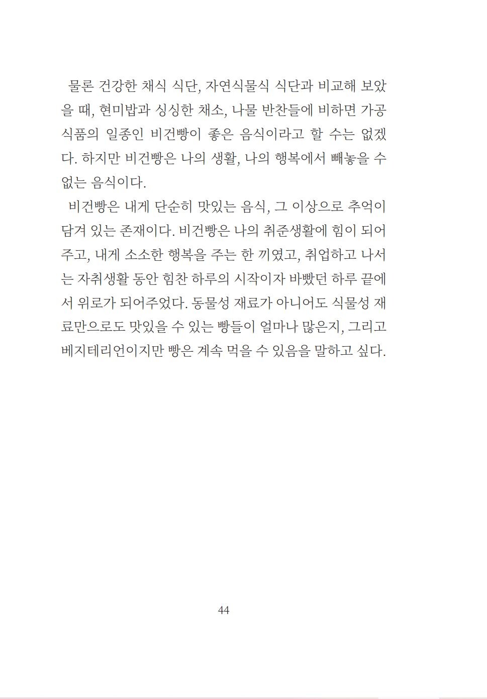 이 책은 비건빵을 매일 먹어온지 어느덧 4년차 빵순이의 비건 빵집 추천, 그리고 최애 빵들에 대한 이야기이다.