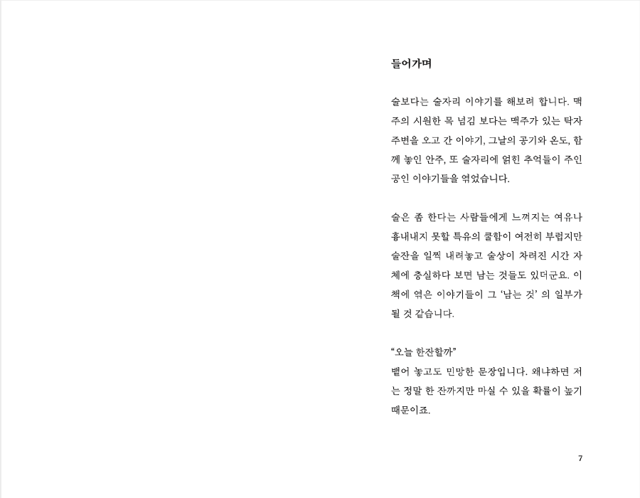 일곱 종류의 술과 그 주변을 오고 간 이야기, 그 날의 공기와 온도, 함께 놓인 안주, 또 술자리에 얽힌 추억과 마음들이 담겨 있습니다. 저자가 나고 자란 도시 광주, 서울의 을지로, 약수역, 성수, 가평의 자라섬 그리고 노르웨이 트롬쇠 등의 공간을 배경으로 합니다. 부디 이 책에 담긴 글들이 또 어떤 이야기의 시작이길.