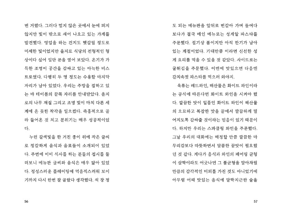 하지만 우리는 스파클링 와인을 주문했다. 그날 우리의 대화에는 매정할 만큼 깔끔한 마무리 감보다 따뜻하면서 달콤한 끝맛이 필요했던 것 같다. - <와인> 중, 55-57p