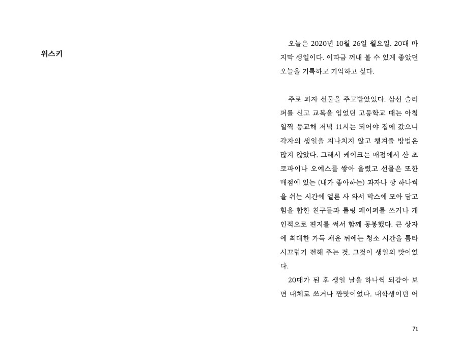 학교 근처 파전이 유명하다 하니 그는 강을 건너 그 먼 길을 왔었다. 겉은 바삭하고 속은 촉촉한 해물파전을 아삭 베어 물고 막걸리로 부드럽게 목너머로 파전을 떠나 보낸다. 몇 번의 젓가락질을 반복하는 동안 우리는 지난 겨울 우리가 만났던 눈 덮인 세상에 관한 이야기를 꺼내어 곱씹었다. 몇 번이고 펼쳐 놓아도 아름다운 광경이었다. - <막걸리> 중 40p