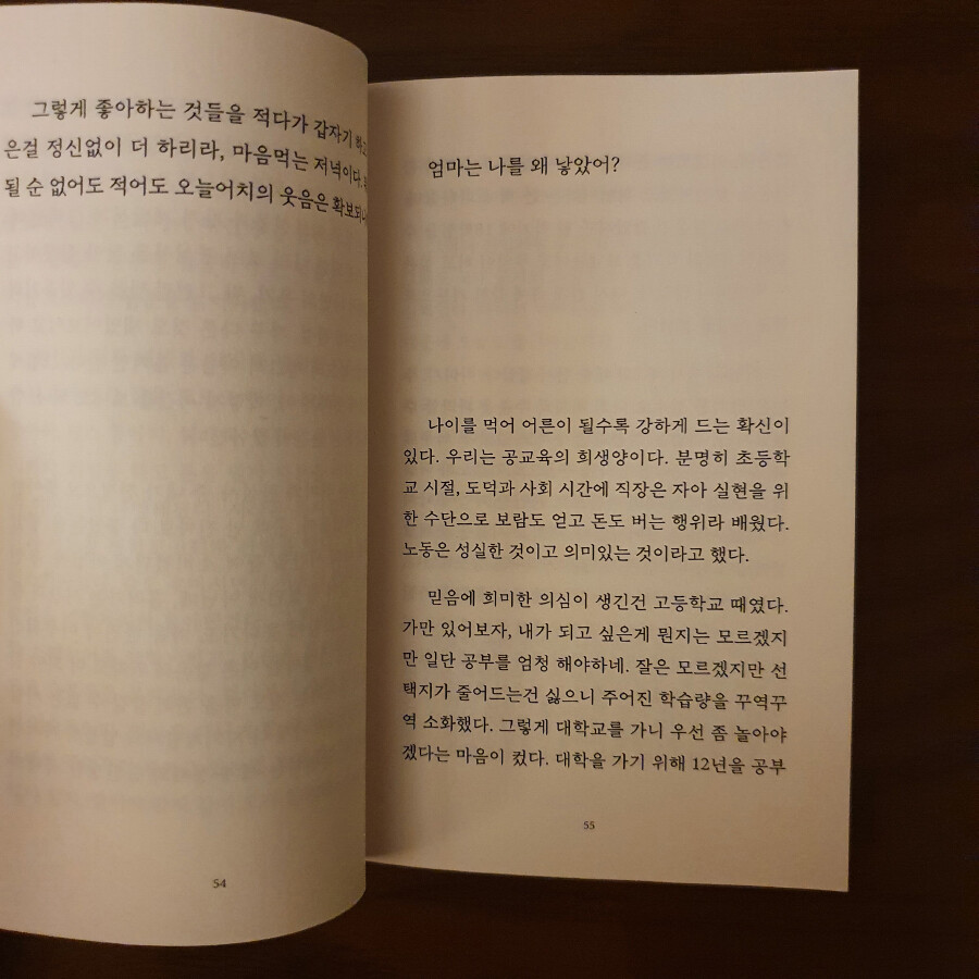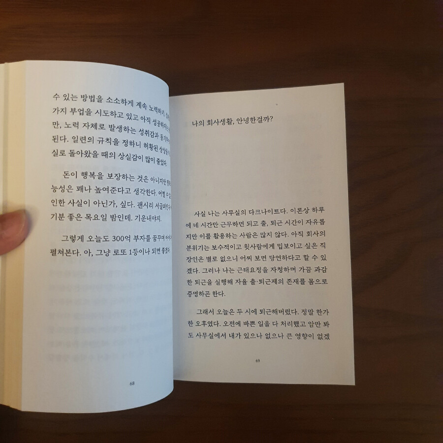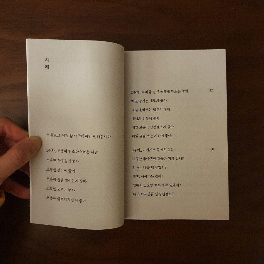 1. 회사원은 참 모순적이다. 말로는 이깟 회사, 라고 센 척 하지만 당장 카드값이 급하고 월급이 아쉽다. 이걸 해야하냐, 라고 푸념하지만 윗사람에게 먼저 보고하며 투명한 꼬리를 흔든다. 회식 왜하냐고 궁시렁 거리지만 누구보다 우렁차게 건배사를 외친다. 이 모든게 생존과 연계되어 있어 어쩔 수 없는 것이겠지만 다같이 하지 않으면 되는데 왜 한 두명의 나댐으로 대다수 가 피해를 입어야 하는지 납득이 되지 않는다. - 3주차, 니의 회사생활, 안녕한걸까?(71p)