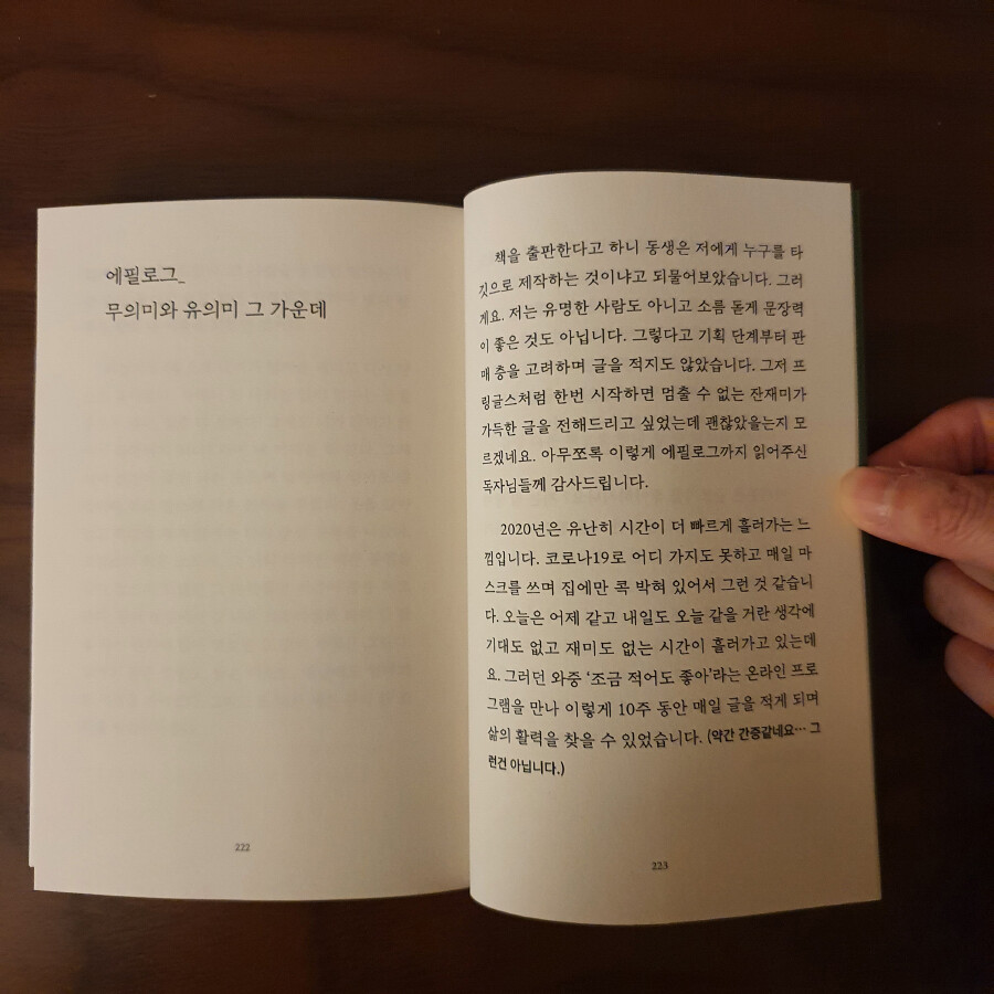 그 결과, 짧은호흡으로 이루어진 문장과 생활 밀착형 테마로 쉬이 읽히면서도 스며드는 공감을 불러일으키는 에세이집을 만들었습니다. 돌이켜보니 나도 몰랐던 감정과 과거를 이해할 수 있는 기록이 남겼고, 제가 느꼈던 글쓰기의 재미를 여러 사람과 나누고 싶어 책으로 엮어 내었습니다. 동네에 한 명쯤 있을법한 친구의 이야기를 읽는다는 기분으로 가볍게 읽어주시면 감사하겠습니다.