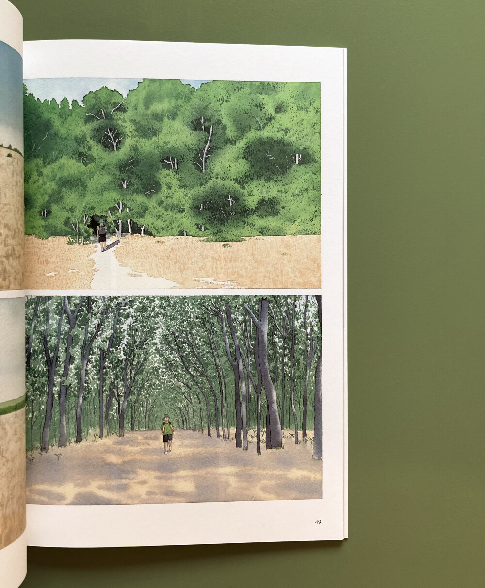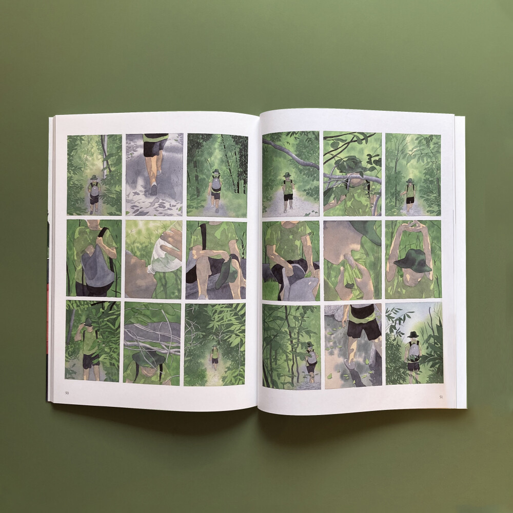 처음 목표로 했던 거대한 폭포에 가지 못하고 적당히 작은 폭포에 들르면서 주인공의 발걸음도 시각도 조금씩 변해간다. 장관을 연출하는 대형 폭포가 그저 바라볼 수만 있는 존재라면 작은 폭포는 바라볼 수도, 건널 수도, 빠져들 수도, 헤엄칠 수도 있는 공간으로 다가왔다. 대단한 풍경에 압도되지 않고 그 속에 어우러져서 역설적으로 그 여정을 그린 작품 <낮게 흐르는>은 작가만의 풍경이 되었다. 짧은 순간에 전체를 관람할 수 있는 60여쪽 그림이지만 정밀하게 묘사된 자연과 그 속으로 흐르는 감정의 길이가 마음에 느리게 스밀 것이다.