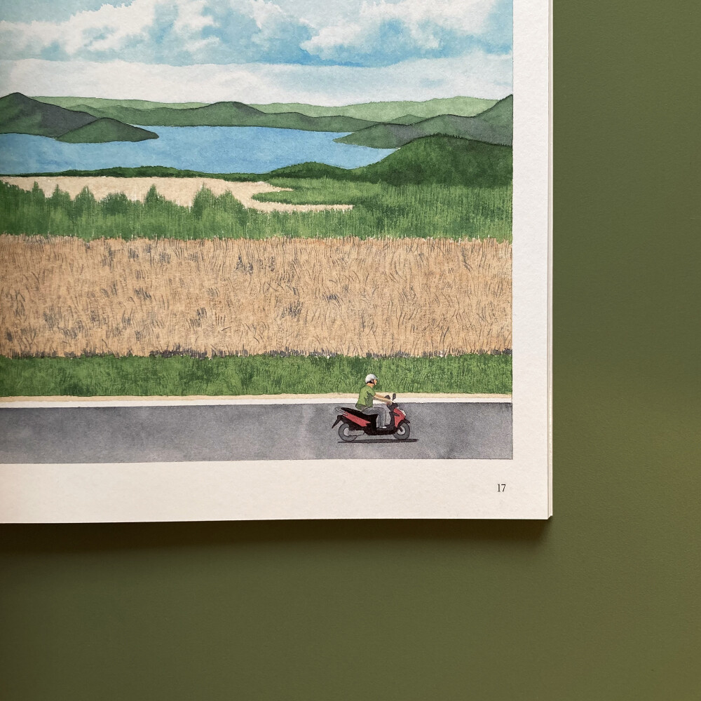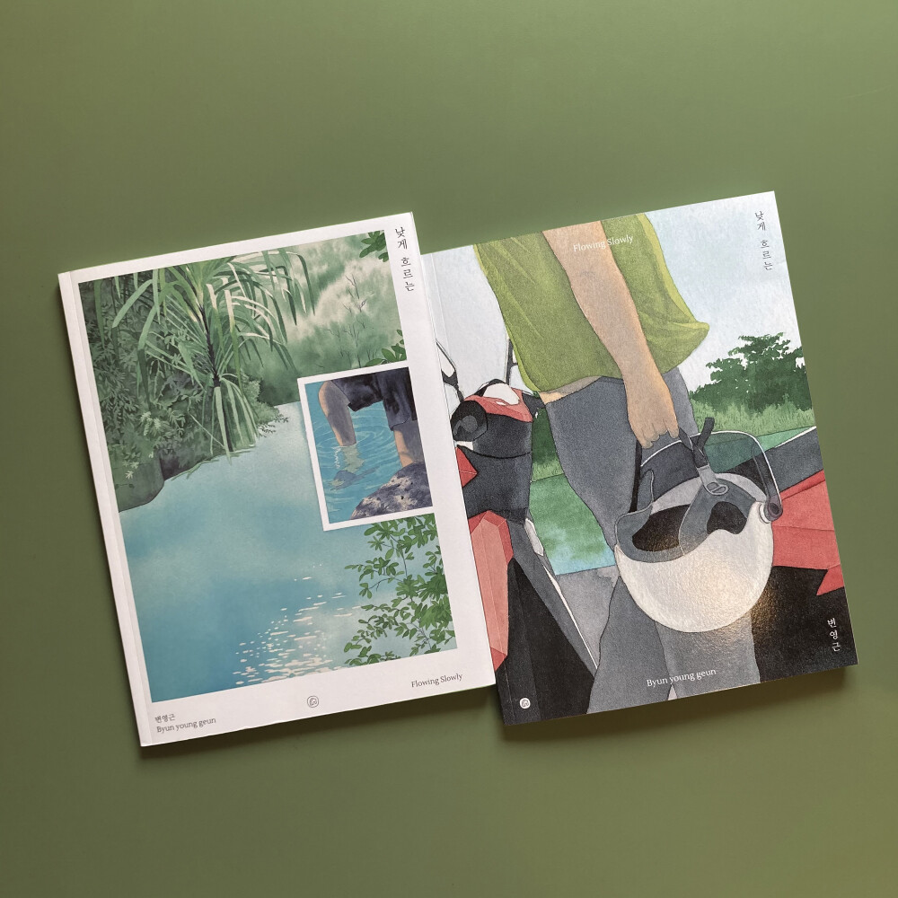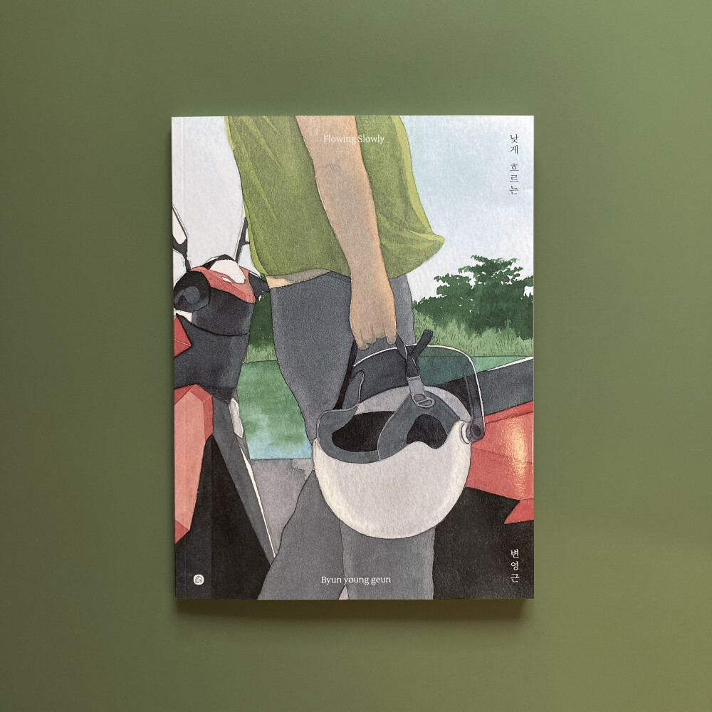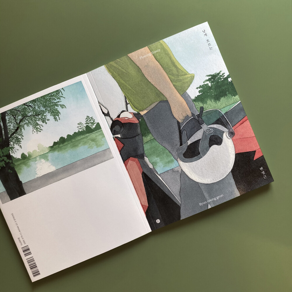 수채도구로 그린 작품을 줄곧 발표해 온 변영근 작가의 신작 <낮게 흐르는(Flowing Slowly)>은 스스로 제작했던 «물안개», «Time Flies at Night», «dry and glow», «in the crowd»와 마찬가지로 화집과 그래픽 노블의 경계에서 구체적인 설명이나 대사 없이 분명한 이야기 한 편을 완성한다. 세심히 구성된 장면과 연출이 짧은 여행길을 긴 감정으로 남겼다.