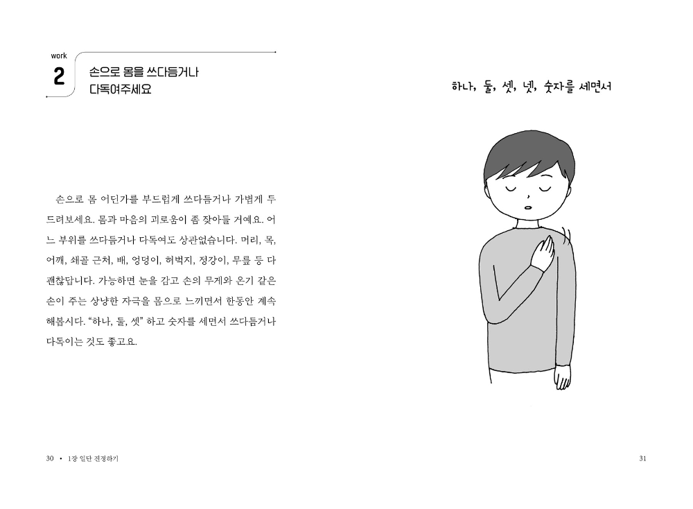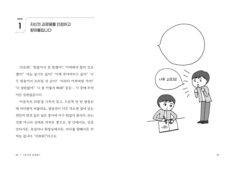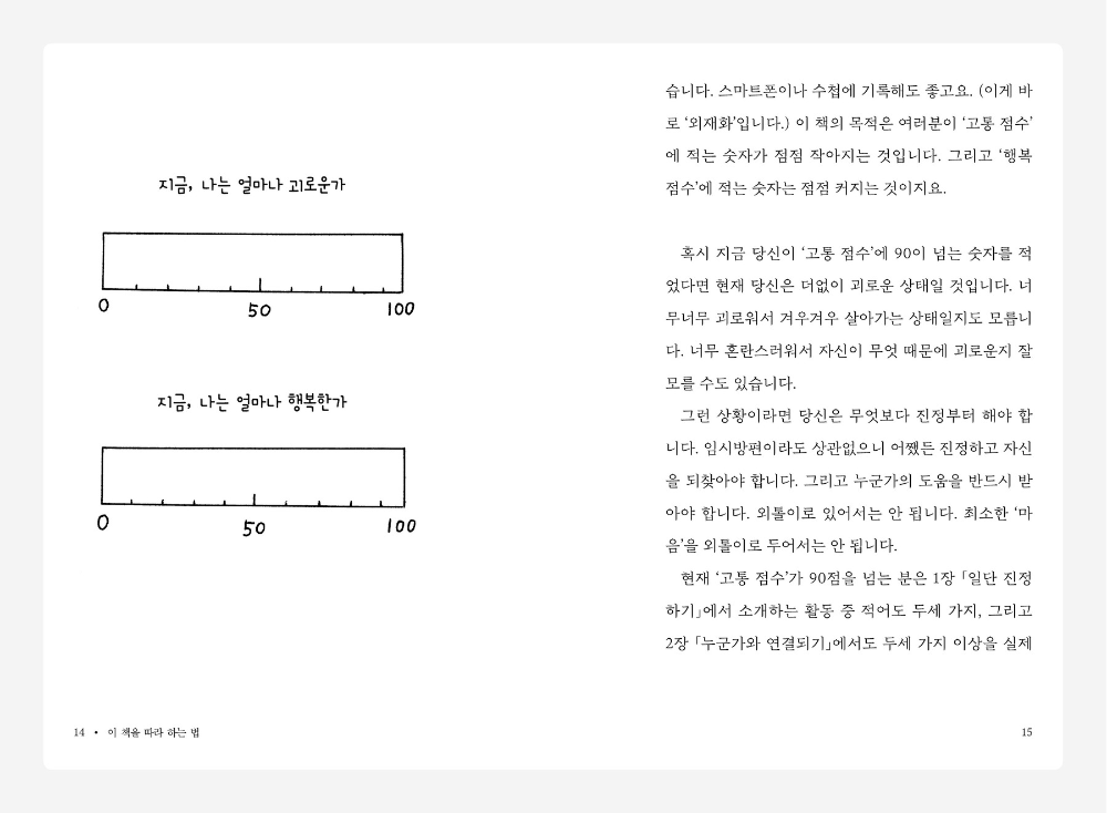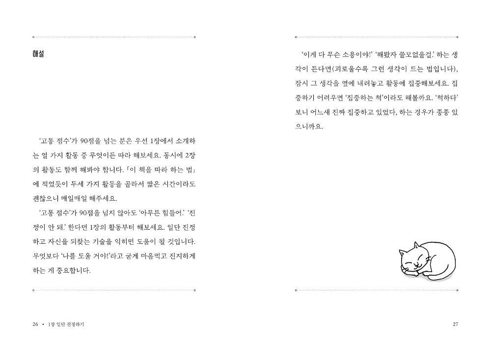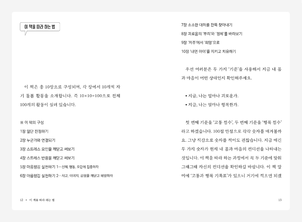 살아 있는 한 우리는 이런저런 스트레스를 겪게 마련입니다. 여러 번 상처 입고 위기에 빠지 기도 하지요. 그럴 때는 부디 이 책에서 소개한 활동 중 한두 가지라도 해보길 바랍니다. 그렇게 살아가주세요. 그리고 살아가면서 늘 자기 자신을 지지하며 도와주세요. 그러다 보면 이 사회 전체가 서로서로를 도와주는 따뜻한 곳이 되리라 생각합니다. _296면 「나가며」 중에서
