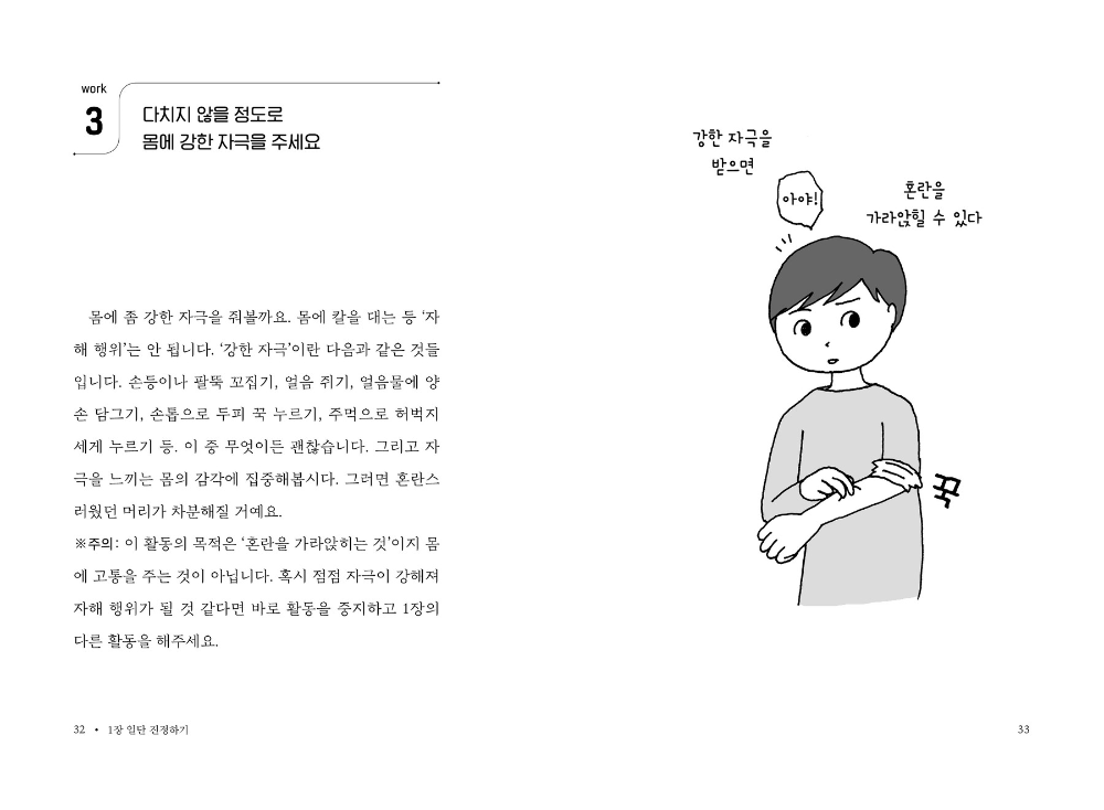 이 책은 전문적인 이론을 토대로 하지만 결코 어렵거나 부담스럽지 않다. 저자는 심신이 약해져 긴 글을 읽기 힘든 이들을 위해 쉬운 단어와 간명한 문장으로 설명하며, 각 활동마다 만화가 호소카와 텐텐의 일러스트를 덧붙여 이해를 돕는다. 언제든 당장 실천할 수 있는 간단한 행동부터 어느 정도 집중이 필요한 명상까지, 독자들이 각자의 스트레스 강도에 맞춰 차례차례 따라 하면 반드시 회복할 수 있게끔 체계적으로 구성되어 있다.