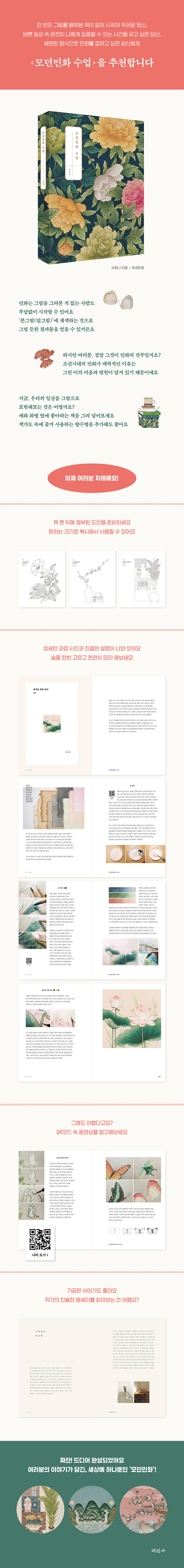 작가가 수업을 진행하며 쌓은 노하우를 수록한 『모던민화 수업』은 총 3장으로 구성되어 있다. 1장에서는 낯선 재료와 기본 기법을 익히며 기초를 다지고, 2장에서는 앞에서 배운 내용을 바탕으로 관찰을 통한 세부 묘사, 다양한 색 조합 등을 시도해본다. 3장에서는 전체를 보는 눈을 키우며 작품에 독창성을 더한다. 책 맨 뒤에 첨부된 도안을 원하는 크기로 응용해서 작업할 수 있고, 이해가 어려운 과정은 중간중간 등장하는 QR코드를 참고하면 된다. 한편, 매장 끝에 등장하는 짧은 에세이야말로 이 책의 백미라고 할 수 있으니 가벼운 마음으로 읽어나갈 것!