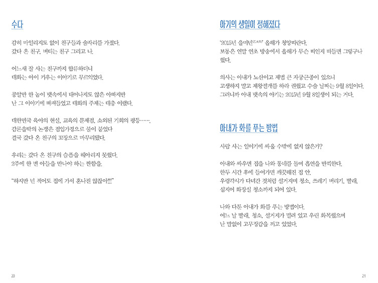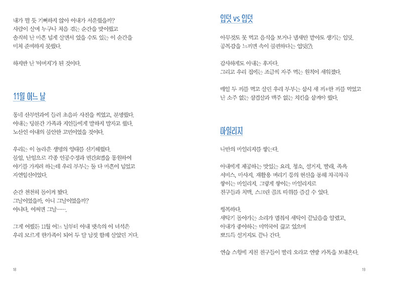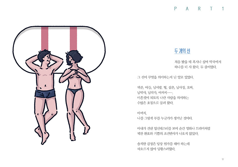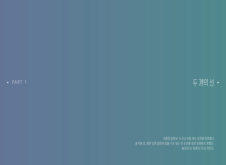아내가 건넨 임신테스터를 보며 순간 영화나 드라마처럼 벅찬 환호와 기쁨의 조건반사가 나오지 않았다. 솔직한 감정은 당장 뭔가를 해야 하는데 떠오르지 않아 당황스러웠다.내가 뛸 듯 기뻐하지 않아 아내가 서운했을까? 사람이 살며 누구나 처음 겪는 순간을 맞이했고 솔직히 난 마흔 넘게 살면서 있을 수도 있는 이 순간을 미처 준비하지 못했다. 하지만 난 ‘아버지’가 된 것이다. --- p.17~p18 <두 개의 선> 중에서
