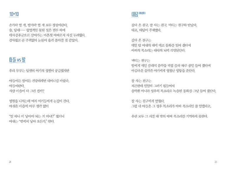 손가락 열 개, 발가락 열 개 모두 정상이란다. 술, 담배…… 합법적인 못된 짓은 전부 하며 대사증후군으로 살아가는 마흔셋 아빠로서 사실 두려웠다. 감사했고 곧 주책없이 눈물이 울컥 쏟아질 것 같았다. --- p.24 <10+10> 중에서