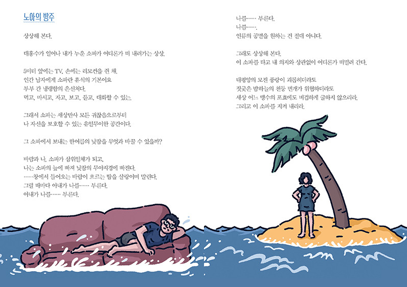 나만의 마일리지를 쌓는다. 아내에게 제공하는 맛있는 요리, 청소, 설거지, 빨래, 족욕 서비스, 마사지, 재활용 버리기 등의 헌신을 통해 차곡차곡 쌓이는 마일리지. 그렇게 쌓이는 마일리지로 친구들과 치맥, 스크린 골프 따위를 즐길 수 있다. --- p.19 <마일리지> 중에서