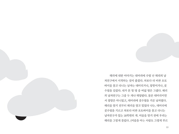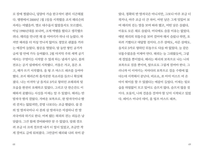 해리는 늘 그래왔듯이, 그렇게 걸었을 뿐이었다. 해리는 해리의 보폭으로 나는 나의 보폭으로 걸을 뿐이며, 앞으로도 그렇게 걸어야 한다. 그러니까 이 이야기는 저마다의 보폭으로 걸을 수밖에 없다는데 시작해서 끝난다. 비로소, 쏘 아이 머스트 비 온 마이 웨이를 할 수 있겠다는 예감이 들었다. 이제는 뒷모습을 하염없이 보고 있어도 슬프지 않다. 슬프지 않을 것이다. 오롯이, 나의 걸음을 걸어야 할 날이 시작되고 있었다. 페이스 어나더 데이. 올 띵즈 머스트 패쓰.