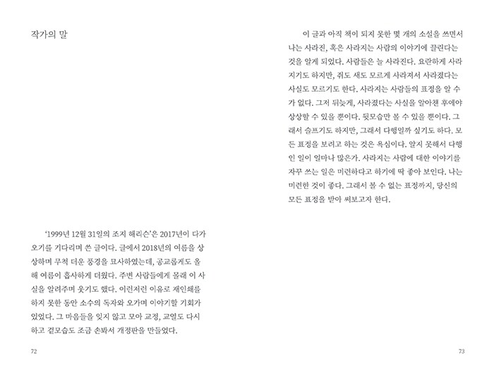 <1999년 12월 31일의 조지 해리슨>은 2000년 1월 1일에 태어난 밀레니엄 베이비 김신과 1999년 12월 31일에 태어난 조해리가 만나게 되는 짧은 소설입니다. 이해하고자 하지만 오해로 끝이 나고, 시작은 늘 명확하지만 끝은 모호해지는 관계의 어려움을 지나온 이야기입니다. 주인공은 10년 동안의 생각 끝에 마침내 자신의 걸음을 걷게 됩니다.