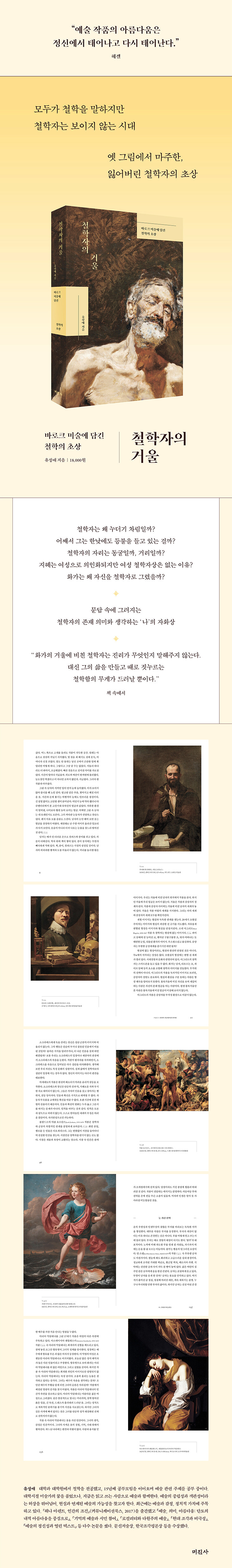 예술이란 건 없고 예술가만 있을 뿐이라는 곰브리치의 통찰은 우리 현실에서 뒤집힌다. 철학자는 없고 철학만 있을 뿐이다. 철학은 위기에 처했던 적이 없다. ‘인문학의 위기’가 철 지난 구호가 된 요즘도, 철학은 사람을 끌어모은다. 독립적인 인생을 살려면, 마음의 상처를 치유하려면, 심지어 성공적인 기업 경영, 업무 관리에도 철학이 필수라고 한다. 목적은 달라도 철학은 언제나 머나먼 이국에서 온다. 당연히 ‘위대한’ 철학자도 그곳에 있다. 그래서 철학자가 곁에 없어도 대수롭지 않게 여기는 걸까? ... 나는 철학자가 누구인지 찾아나섰다. 낡은 사진 한 장 들고 지워진 기억으로 걸어 들어가는 소설 속 탐정처럼. 바로크 그림 속 철학자에서 출발하기로 했다. 그림으로 철학자를 알 수 있을까? 먼 나라의 오래된 그림이 진실의 단서가 될 수 있을까?