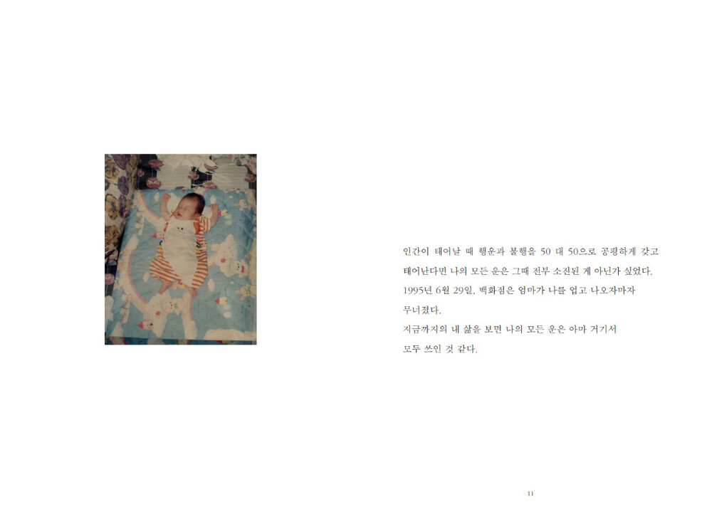 “인간이 태어날 때 행운과 불행을 50 대 50으로 공평하게 갖고 태어난다면 나의 모든 운은 그때 전부 소진된 게 아닌가 싶었다. 1995년 6월 29일, 백화점은 엄마가 나를 업고 나오자마자 무너졌다.