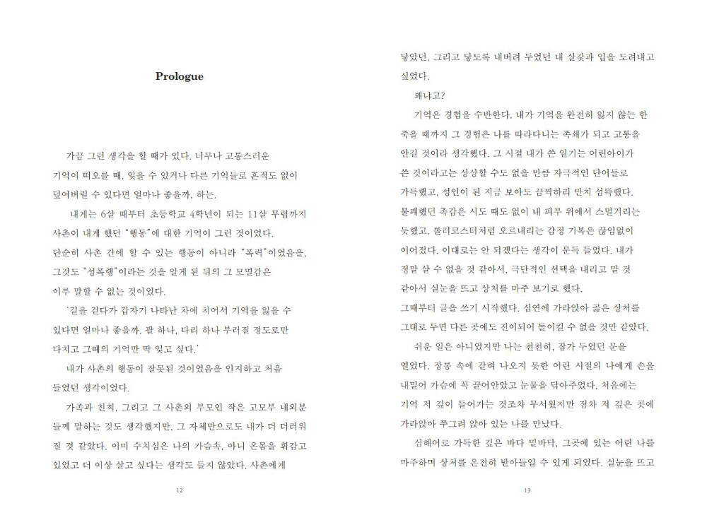 큰 상처와 부끄러움을 안고 누구에게도 털어놓지 못했던 저의 이야기이며, 그 때의 기억으로 인해 지금까지도 트라우마와 고통에 시달리고 있지만 같은 상처를 갖고 있는 누군가에게는 따뜻한 위로가 되고 다시는 이러한 일이 없기를 바라는 마음을 담아 집필하였습니다.