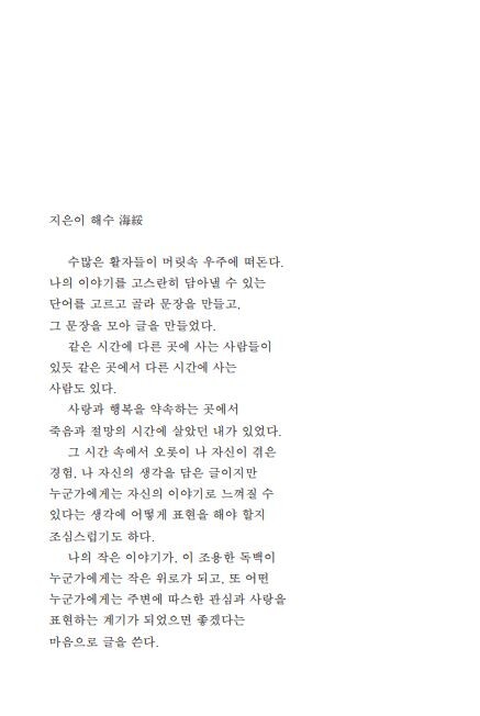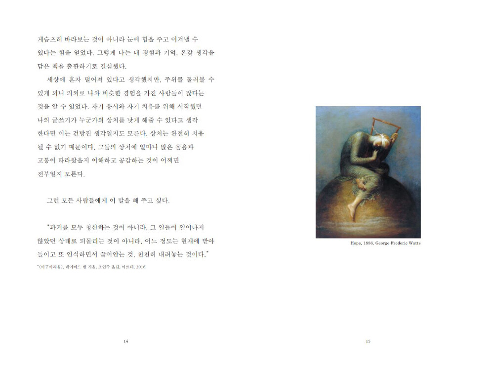 고통을 텍스트로 구현하기 위해서는 그 당시의 아픔으로 다시 들어가야 했습니다. 그런 쓰라린 상처에 소금을 뿌리는 자학적인 쾌감을 맛보기도 하며 써내려간 이 책은 당시의 기억을 잊지 않기 위해 기록한 조용한 독백이자 삶을 담은 비망록과도 같습니다.