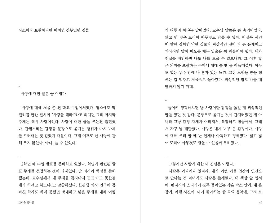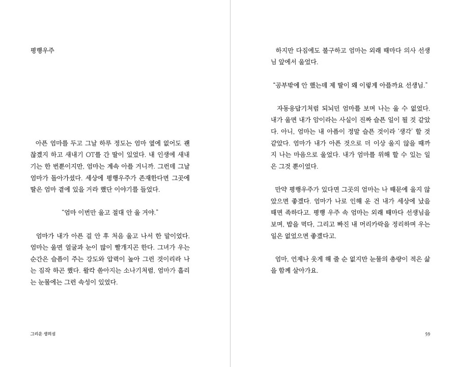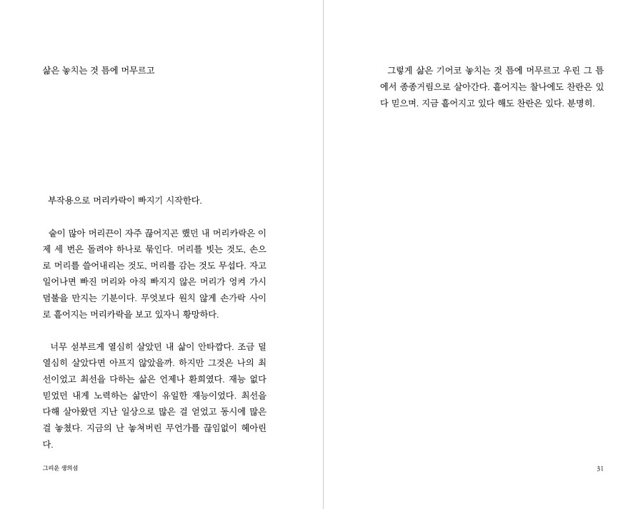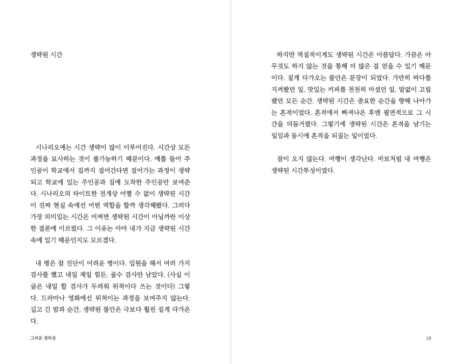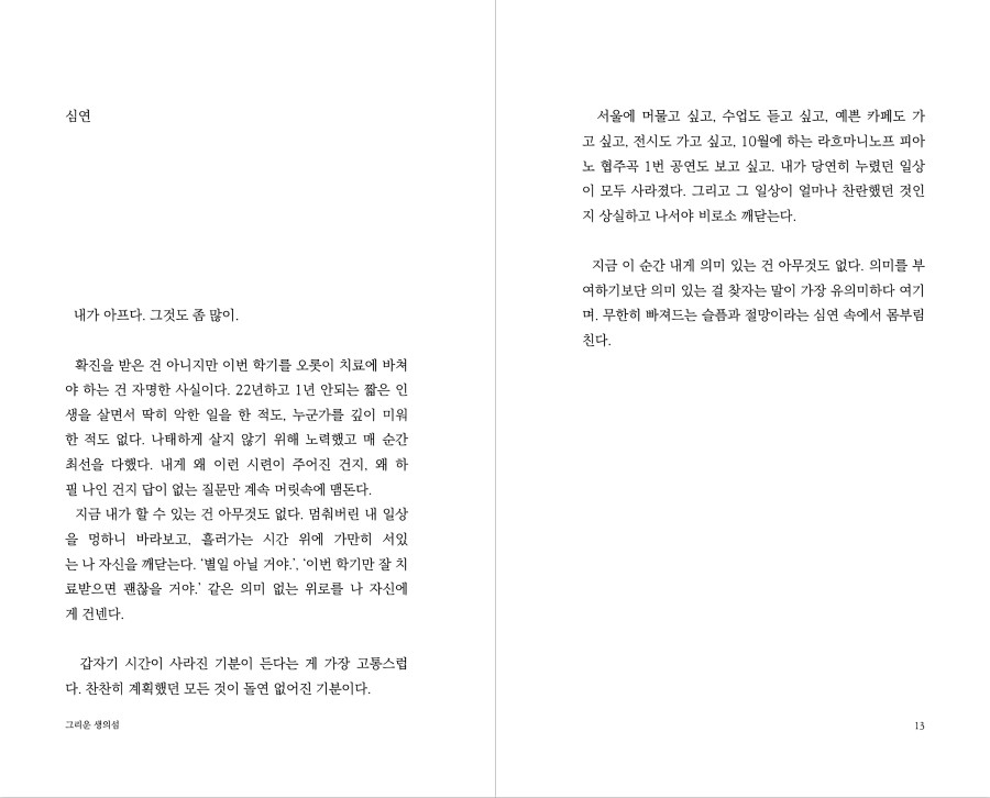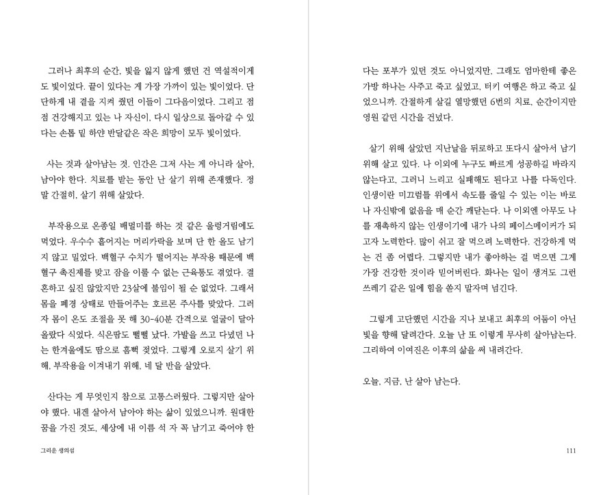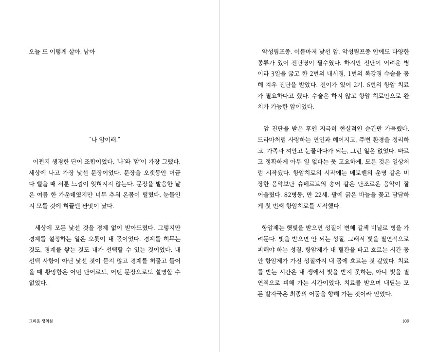 사람들은 저마다의 방식으로 시간을 견딘다고 생각합니다. 23살, 선택으로 메워왔던 인생에서 선택할 수 없었던 암 진단 이후 제가 선택한 시간을 견디는 방식은 글이었습니다. 항암치료를 받는 동안, 그리고 그 이후의 삶 속에서도 문장을 이어 붙이며 모든 시간의 결을 견딜 수 있었습니다. 제가 견딘 모든 희망과 불행을 세상에 내놓습니다.