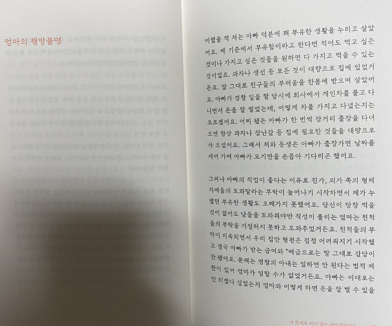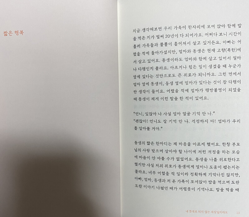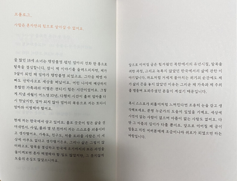 9살이 되던 해 엄마와의 이별(행방불명), 그 다음해 아빠의 죽음을 맞이하며 외톨이가 된 후 저의 삶의 과정과 함께 탈북, 그리고 한국에서의 정착생활에 대하여 쓴 에세이입니다.